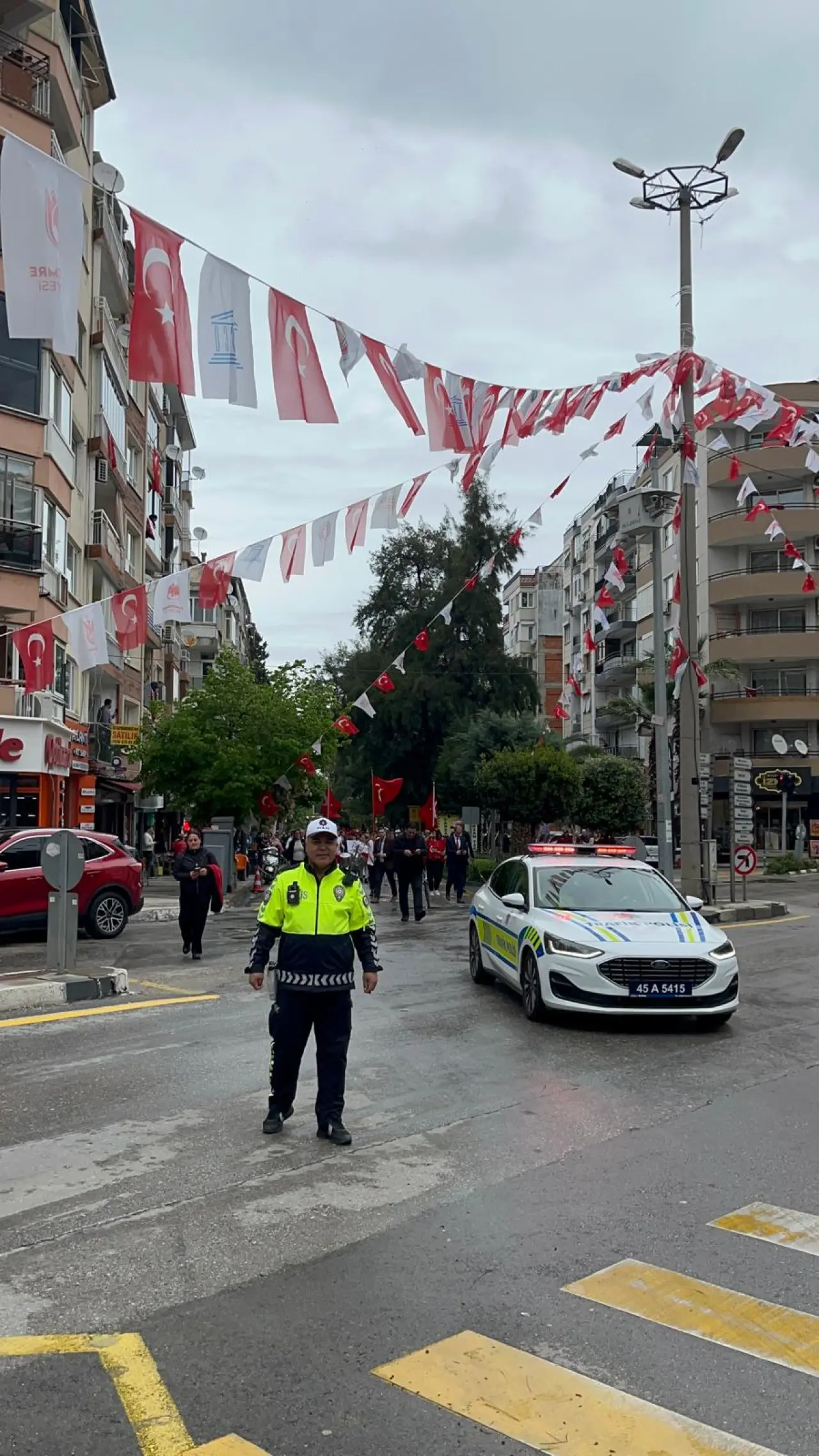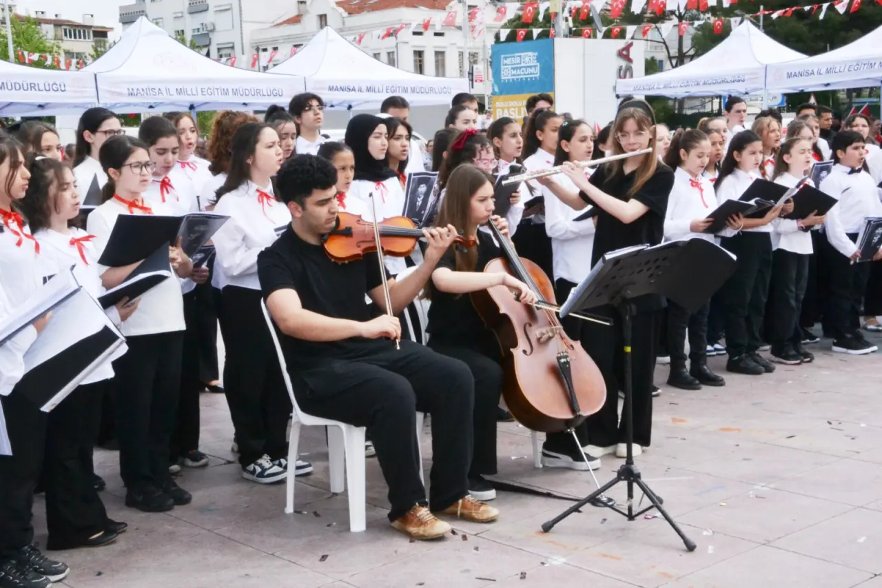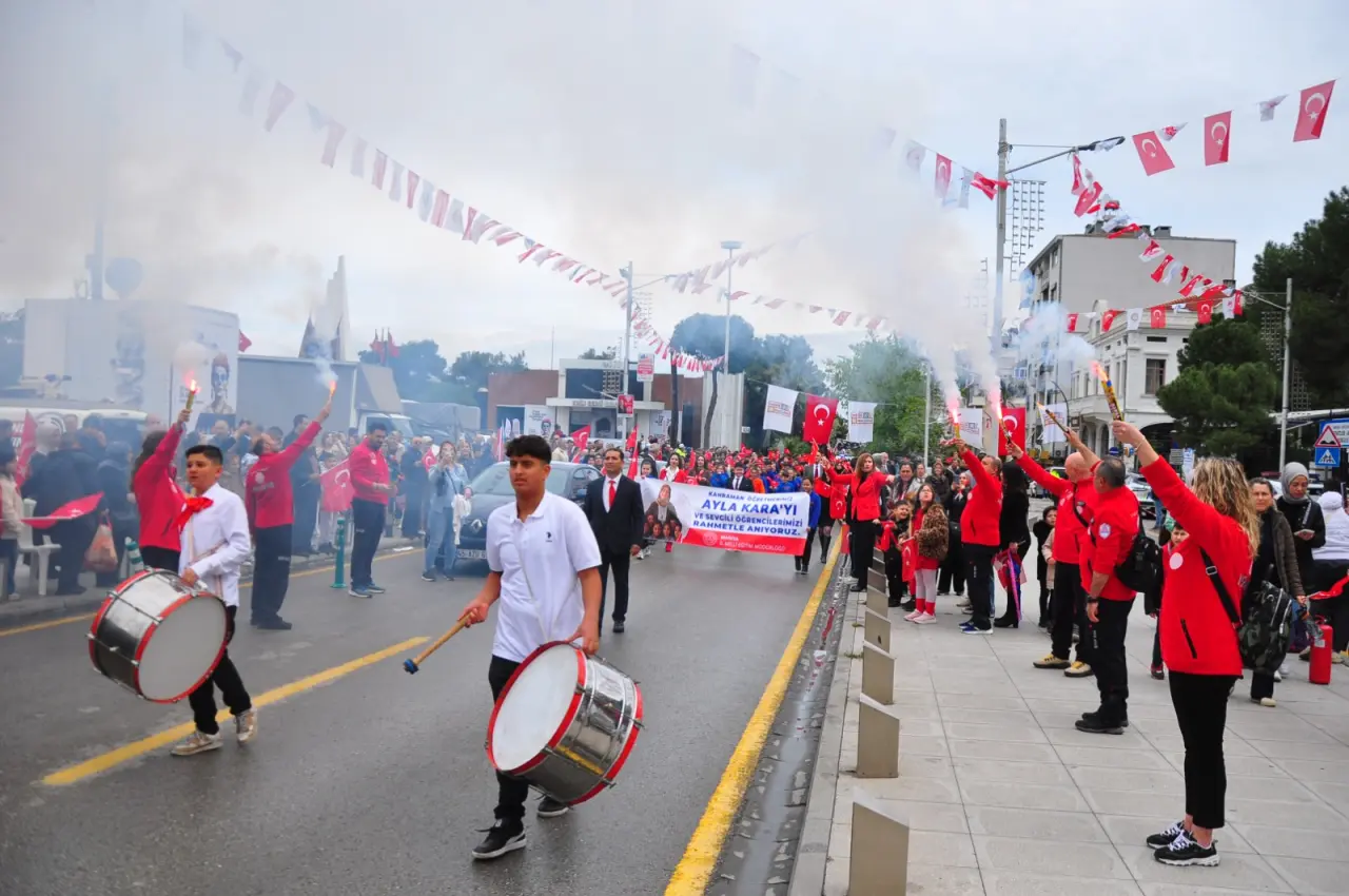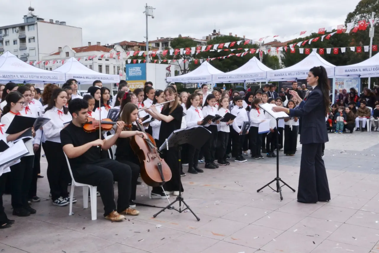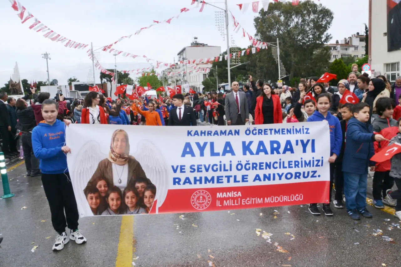 Öğrenciler bando takımı eşliğinde Atatürk Bulvarı üzerinden Cumhuriyet Meydanına kadar yürüdü. Cumhuriyet Meydanında gerçekleşen törene Manisa Valisi Vahdettin Özkan, Manisa Büyükşehir Belediye Başkanı Besim Dutlulu, Manisa Cumhuriyet Başsavcısı Kurtca Eker, Manisa İl Jandarma Komutanı Tuğgeneral İlhan Şen, Manisa Emniyet Müdürü Fahri Aktaş, Manisa Celal Bayar Üniversitesi Rektörü Prof. Dr. Rana Kibar, Manisa Barosu Başkanı Sevgi Başak Yeşil, AK Parti Manisa İl Başkanı Süleyman Turgut, CHP Manisa İl Başkanı İlksen Özalper, MHP Manisa İl Başkanı Cüneyt Tosuner, İyi Parti Manisa İl Başkanı Yunus Koca, Yunusemre Belediye Başkanı Semih Balaban, Şehzadeler Belediye Başkanı Hakan Şimşek, siyasi parti temsilcileri katıldı. Yaşanan olaylarda hayatını kaybeden öğretmen Ayla Kara ve öğrenciler için 1 dakikalık saygı duruşunda bulunuldu, İstiklal Marşı okundu.