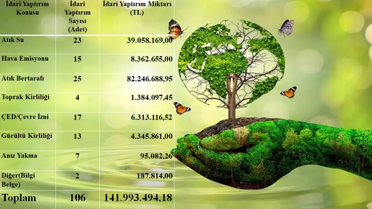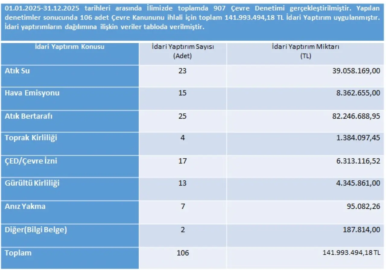 Uygulanan idari yaptırımların büyük bölümünü atık bertarafı ve atık su ihlalleri oluşturdu. Denetimler kapsamında en yüksek ceza, 82 milyon 246 bin TL ile atık bertarafı ihlallerine kesildi. Bu alanı 39 milyon 58 bin TL ile atık su kaynaklı ihlaller izledi. Hava emisyonu ihlallerine 8 milyon 362 bin TL, ÇED ve çevre izni ihlallerine ise 6 milyon 313 bin TL ceza uygulandı. Ayrıca gürültü kirliliği, toprak kirliliği, anız yakma ve bilgi-belge eksikliği gibi ihlaller nedeniyle de çeşitli idari yaptırımlar uygulandı. Yetkililer, çevrenin korunması ve sürdürülebilir yaşamın sağlanması amacıyla denetimlerin artarak devam edeceğini, mevzuata aykırı faaliyetlere karşı sıfır tolerans anlayışıyla hareket edildiğini vurguladı.