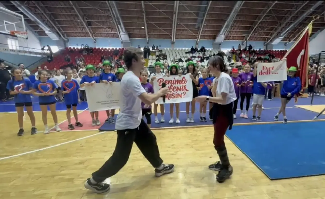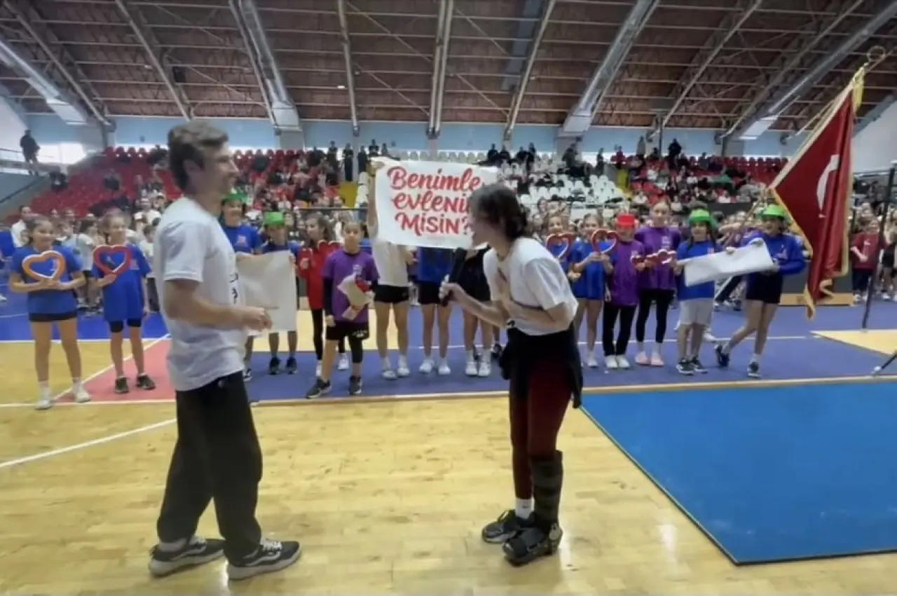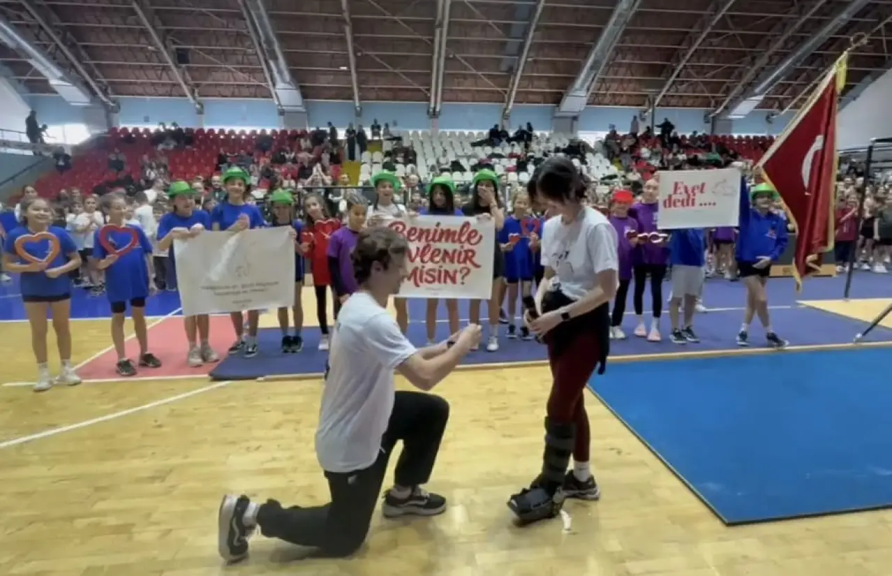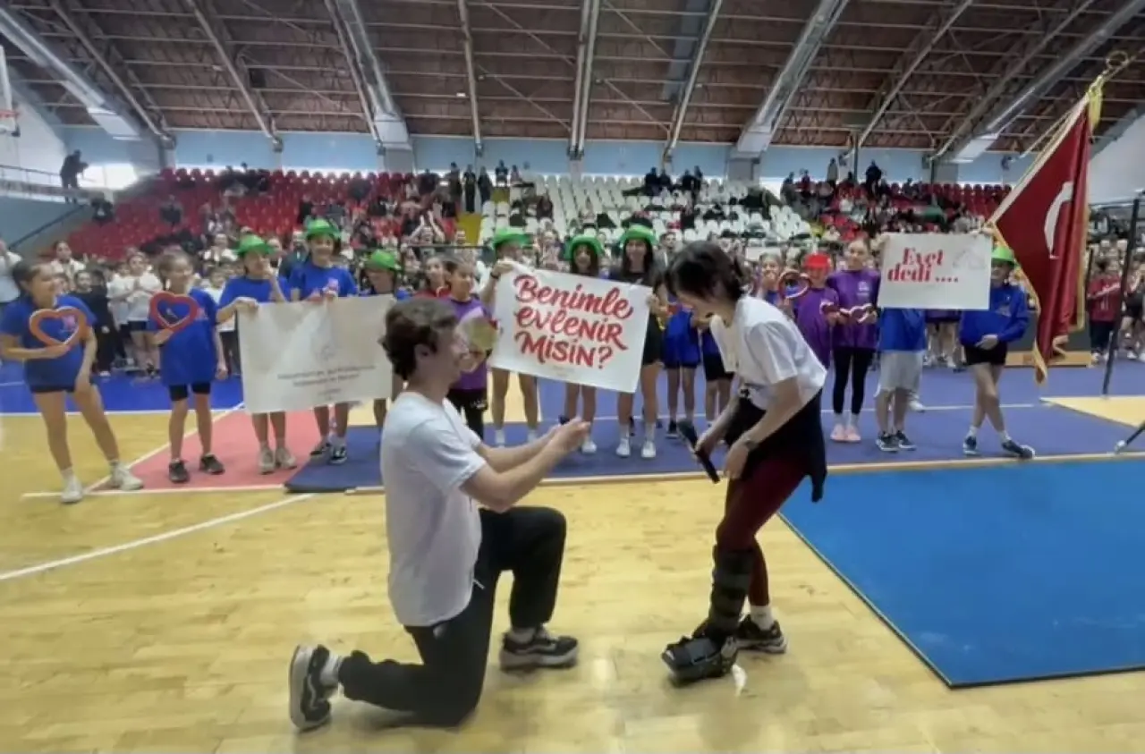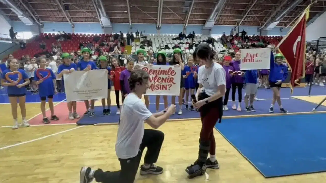 Atatürk Spor Salonu’nda gerçekleştirilen organizasyonda, seremoni sırasında duygusal anlar yaşandı. Adana’dan cimnastik antrenörü Ahmet Yıldız, Ankara’dan antrenör İlkim Vurucu’ya sürpriz bir evlilik teklifinde bulundu. Sporcuların “Benimle evlenir misin?” yazılı pankart açtığı anlarda, Yıldız diz çökerek yüzükle teklifini yaptı. Vurucu’nun “Evet” yanıtı salonda büyük alkış aldı.