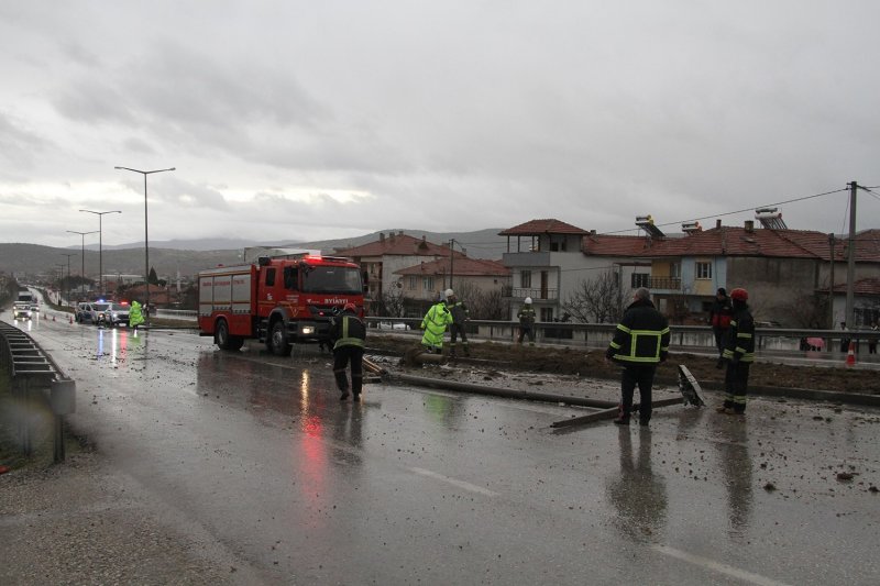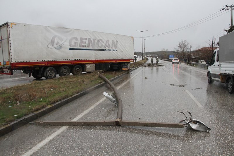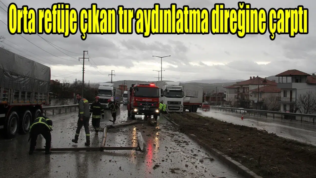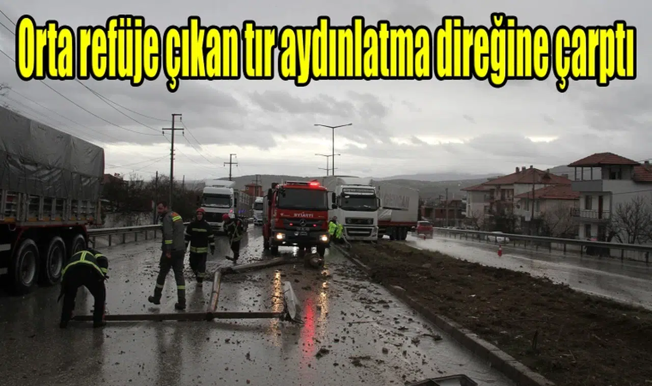 Karayolunda savrulan tır, orta refüje çıkarak aydınlatma direklerini devirdi. Kaza esnasında karayolunun her iki istikametinde de araç bulunmaması büyük bir faciayı önlerken, tır sürücüsü de kazayı yara almadan atlattı.