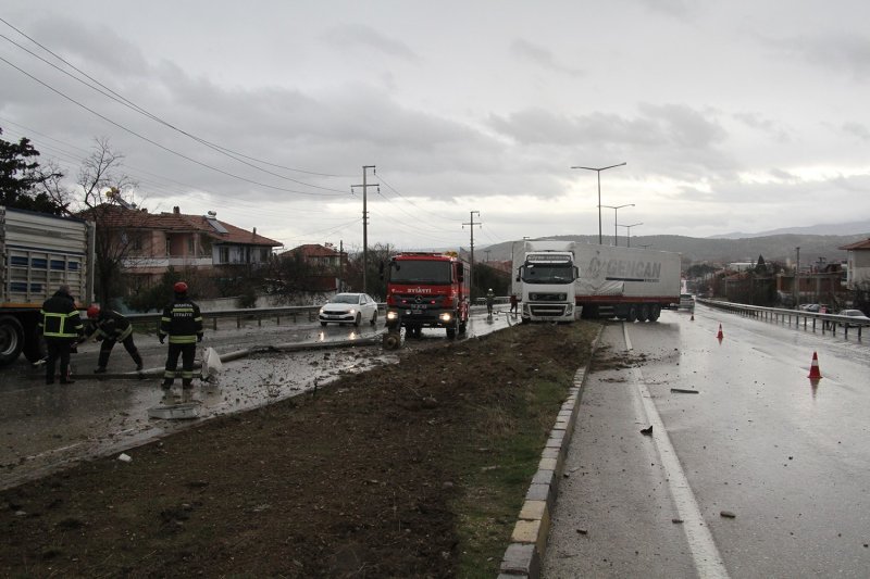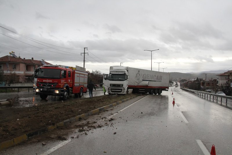 Kaza, saat 11.00 sıralarında İzmir-Ankara D300 karayolu Kavacık rampalarında meydana geldi. Edinilen bilgiye göre İzmir’den Uşak istikametine seyir halinde olan İnan Yaman (31) idaresindeki 61 K 12161 plakalı tır, geceden bu yana süren yağmur yağışının da etkisiyle kayganlaşan yolda sürücüsünün kontrolünden çıktı.