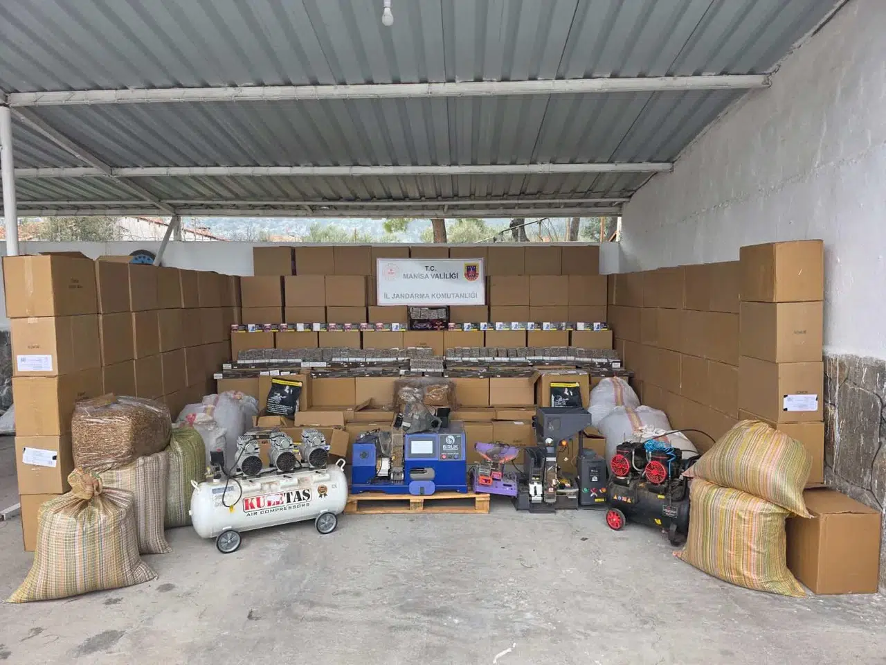 İl Jandarma Komutanlığı KOM Şube Müdürlüğü ekiplerince kaçakçılık suçlarıyla mücadele kapsamında 17 Mart'ta Kırkağaç ilçesinde H.T. isimli şahsa ait iş yeri, depo ve eklentilerinde arama yapıldı. Aramalarda 2 milyon 632 bin 600 adet boş makaron, 233 bin 160 adet içi tütün doldurulmuş sigara, 565 kilogram açık kıyılmış tütün, 3 adet elektronik sigara sarma makinesi ile 2 adet kompresör ele geçirildi.