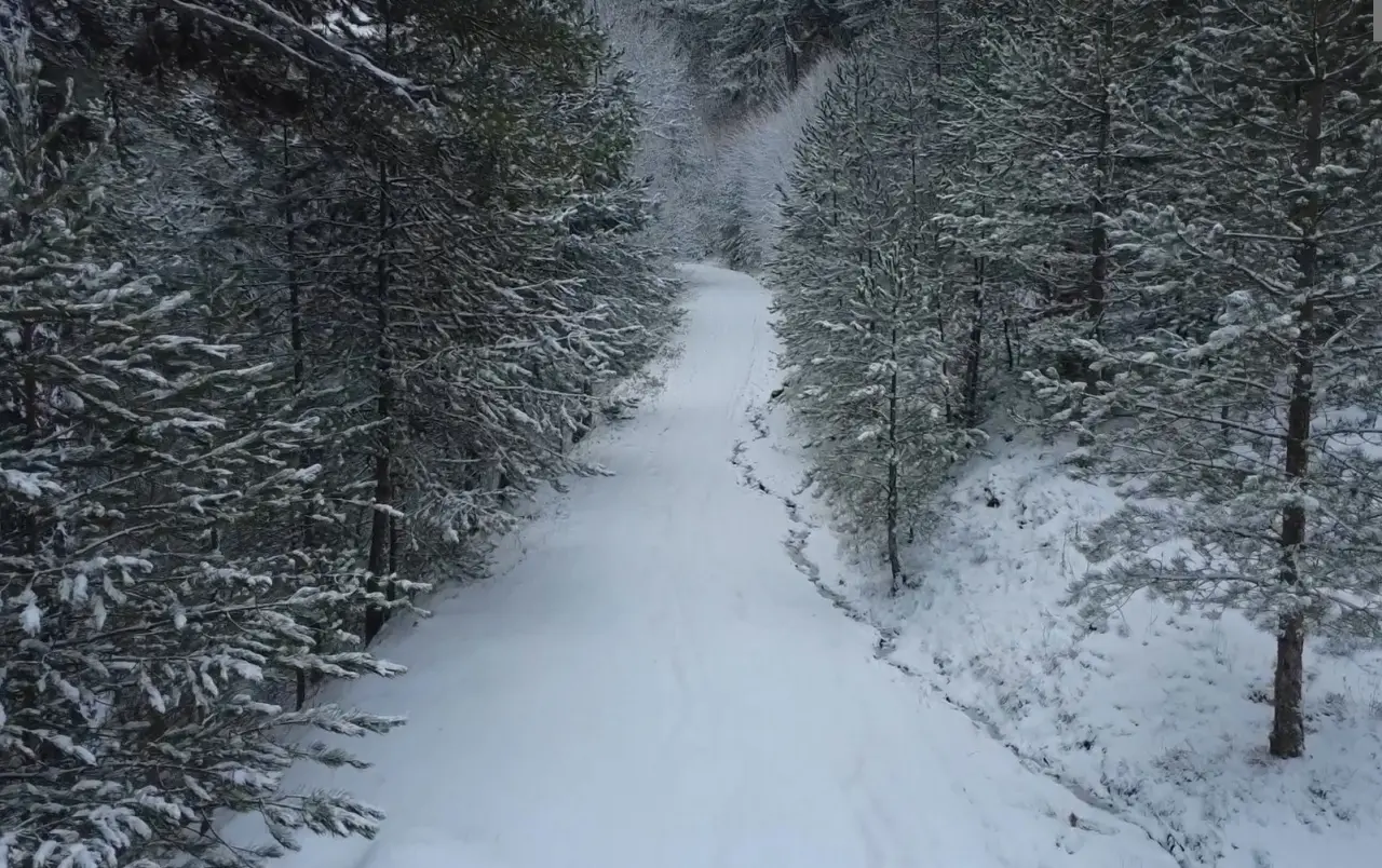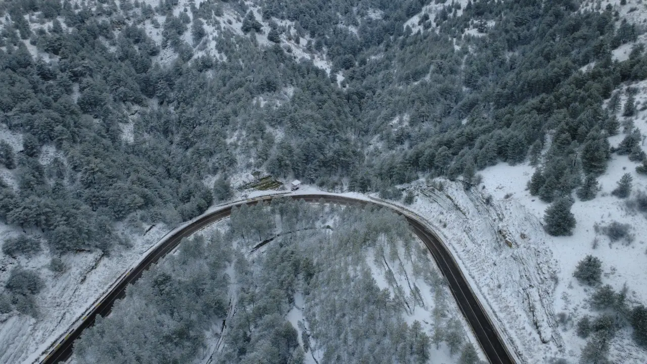 Drone ile kaydedilen görüntülerde, karla kaplanan dağ silsileleri, ormanlık alanlar ve kıvrılarak uzanan yollar görsel bir şölen sundu.