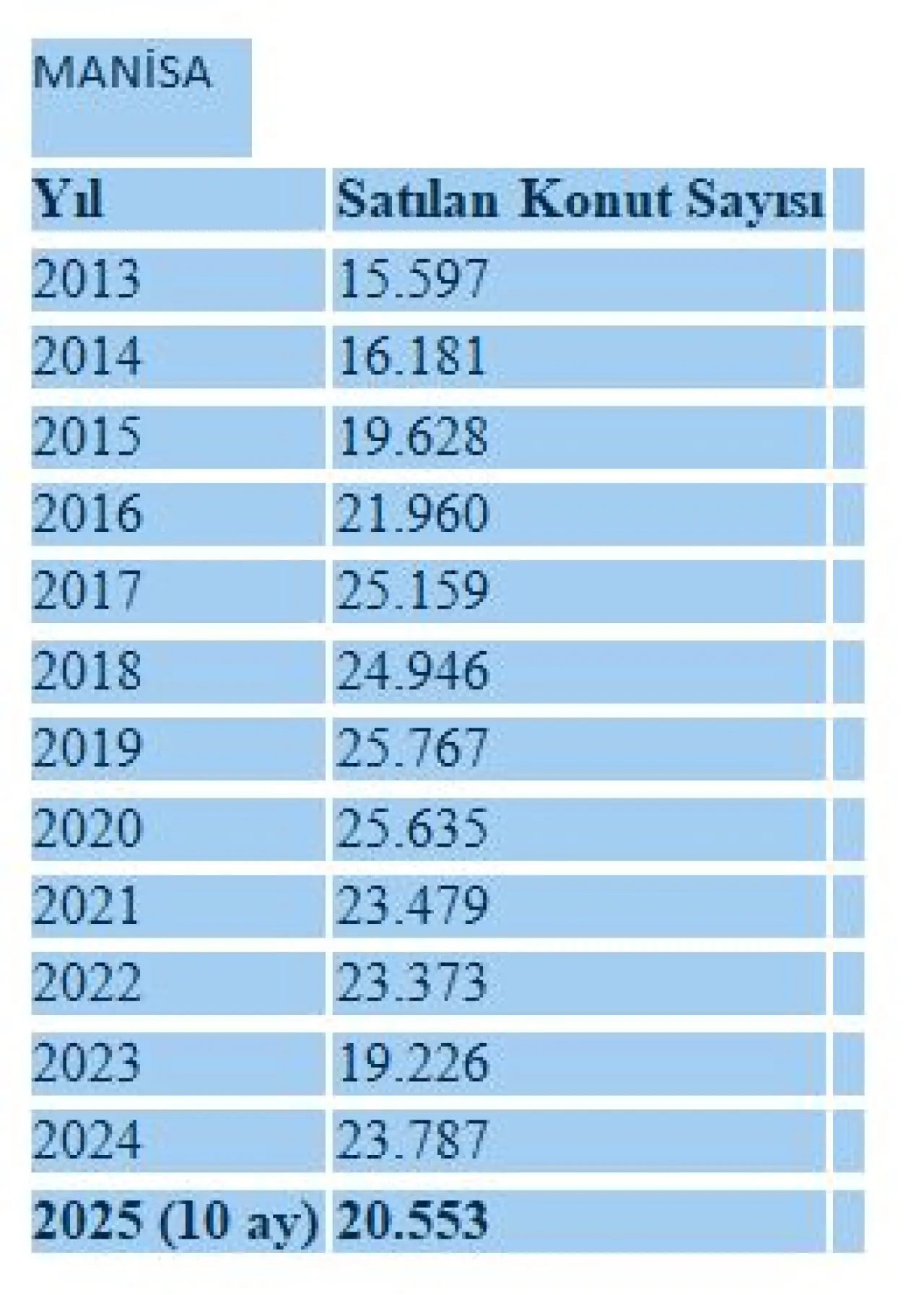 Manisa’da 2013 yılında 15 bin 597 konut, 2014 yılında 16 bin 181 konut, 2015 yılında 19 bin 628 konut, 2016 yılında 21 bin 960 konut satıldı. 2017 yılında 25 bin 159 konut, 2018’de 24 bin 946 konut, 2019’da 25 bin 767 konut, 2020’de 25 bin 635 konut satıldı. 2021’de 23 bin 479 konut, 2022’de 23 bin 373 konut, 2023’te 19 bin 226 konut, 2024’te 23 bin 787 konut satıldı. 2025 yılının Ocak-Ekim dönemindeki 10 aylık süreçte ise 20 bin 553 konut satışı gerçekleşti.