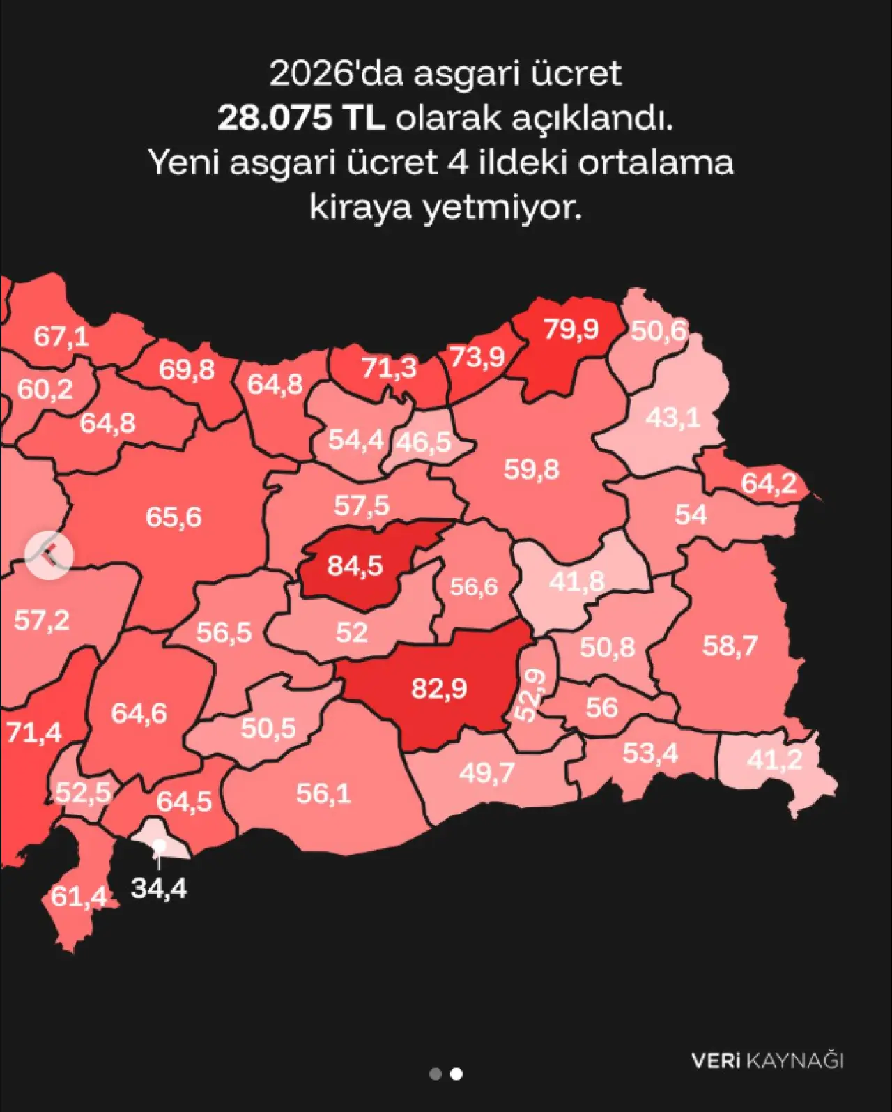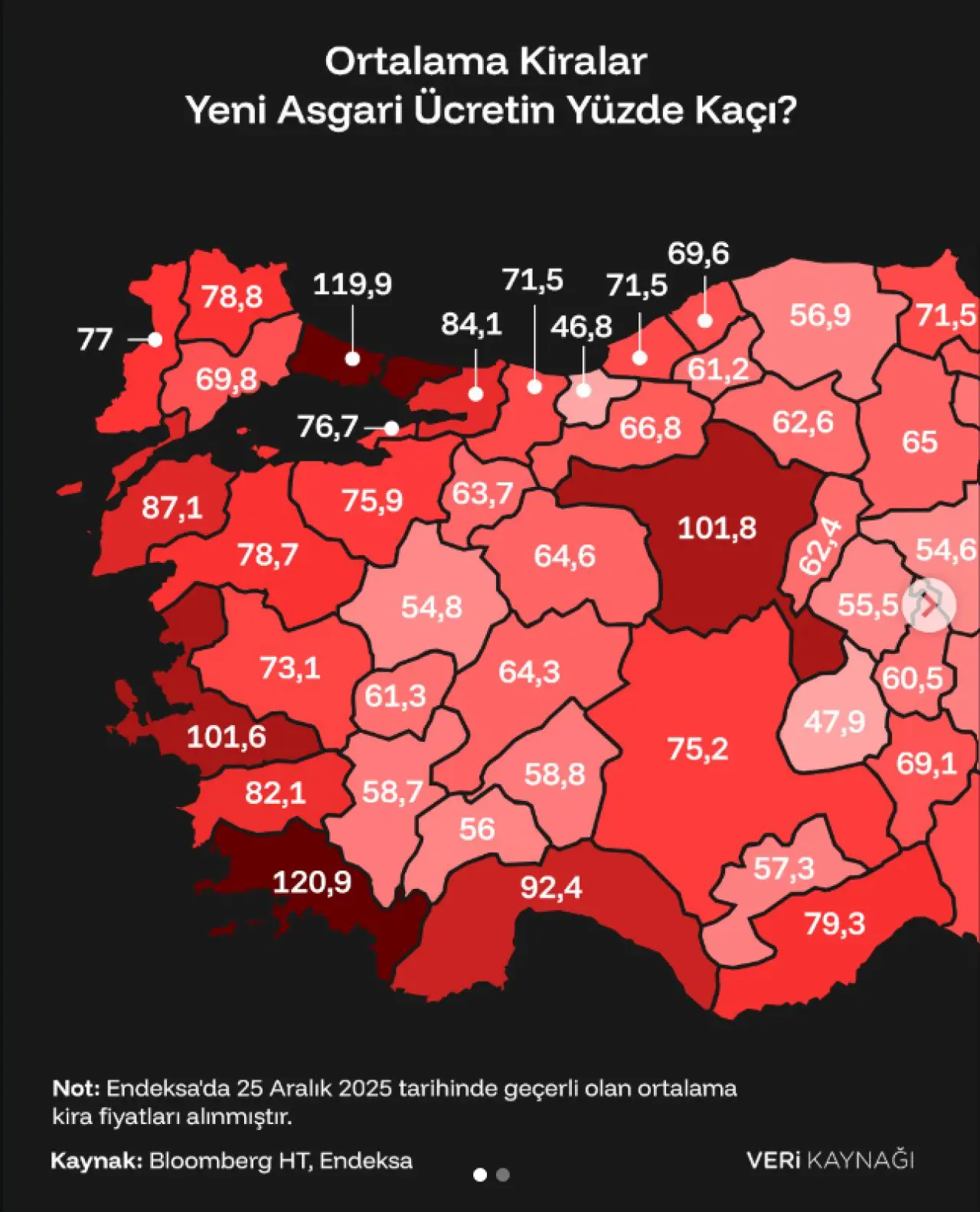 2026 yılında asgari ücret 28 bin 75 lira olarak hesaplandı. Yeni yılın gelmesiyle birlikte birçok ürüne ve kira fiyatlarına zam geldi. Bloomberg HT ve Endeksa verilerine göre, bazı illerde ortalama kira bedelleri asgari ücretin tamamını aşarken, birçok şehirde ise maaşın yüzde 70’inden fazlasının kiraya gittiği belirlendi. Asgari ücretli bir çalışanın aldığı maaştan yüksek kira ödemek zorunda kaldığı iller arasında ilk sıralarda yüzde 120,9 ile Muğla, ikinci sırada yüzde 119,9 ile İstanbul, üçüncü sırada yüzde 101,8 ile Antalya, yüzde 101,6 ile İzmir ve yüzde 92,4 ile Mersin barınmanın en yüksek olduğu iller arasında yer aldı.