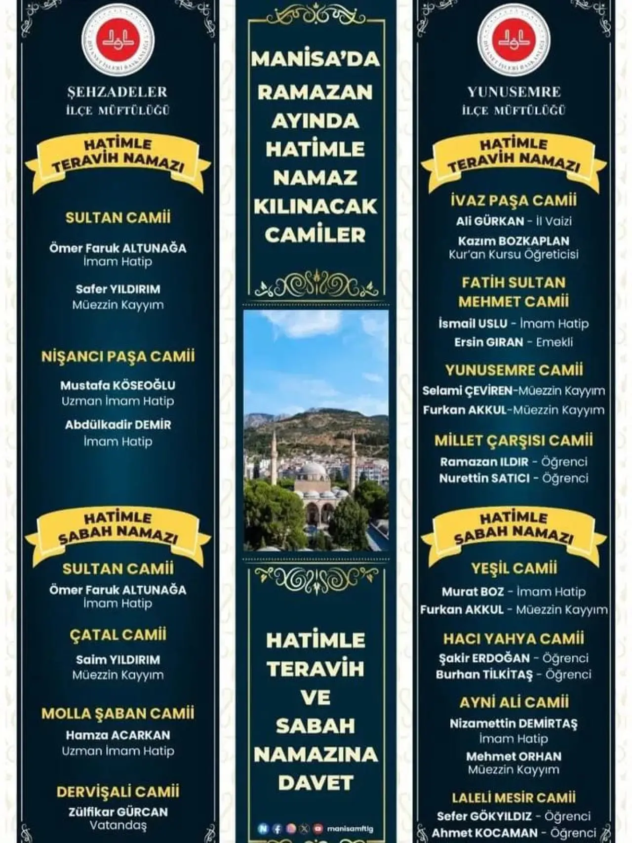 Müslüman alemi için 11 aydan daha hayırlı kabul edilen Ramazan Ayı 18 Şubat Çarşamba günü gecesi kalkılacak sahur ile başlayacak. Manisa İl Müftülüğü, Ramazan ayı boyunca Manisa merkezdeki camilerde görev alacak imam-hatip, müezzin-kayyım, vaiz ve Kur’an kursu öğreticilerinin isimlerini açıkladı. Program kapsamında vatandaşlar, belirlenen camilerde hatimle teravih ve sabah namazlarına katılabilecek. İşte Yunusemre ve Şehzadeler ilçelerinde ki cami listesi: