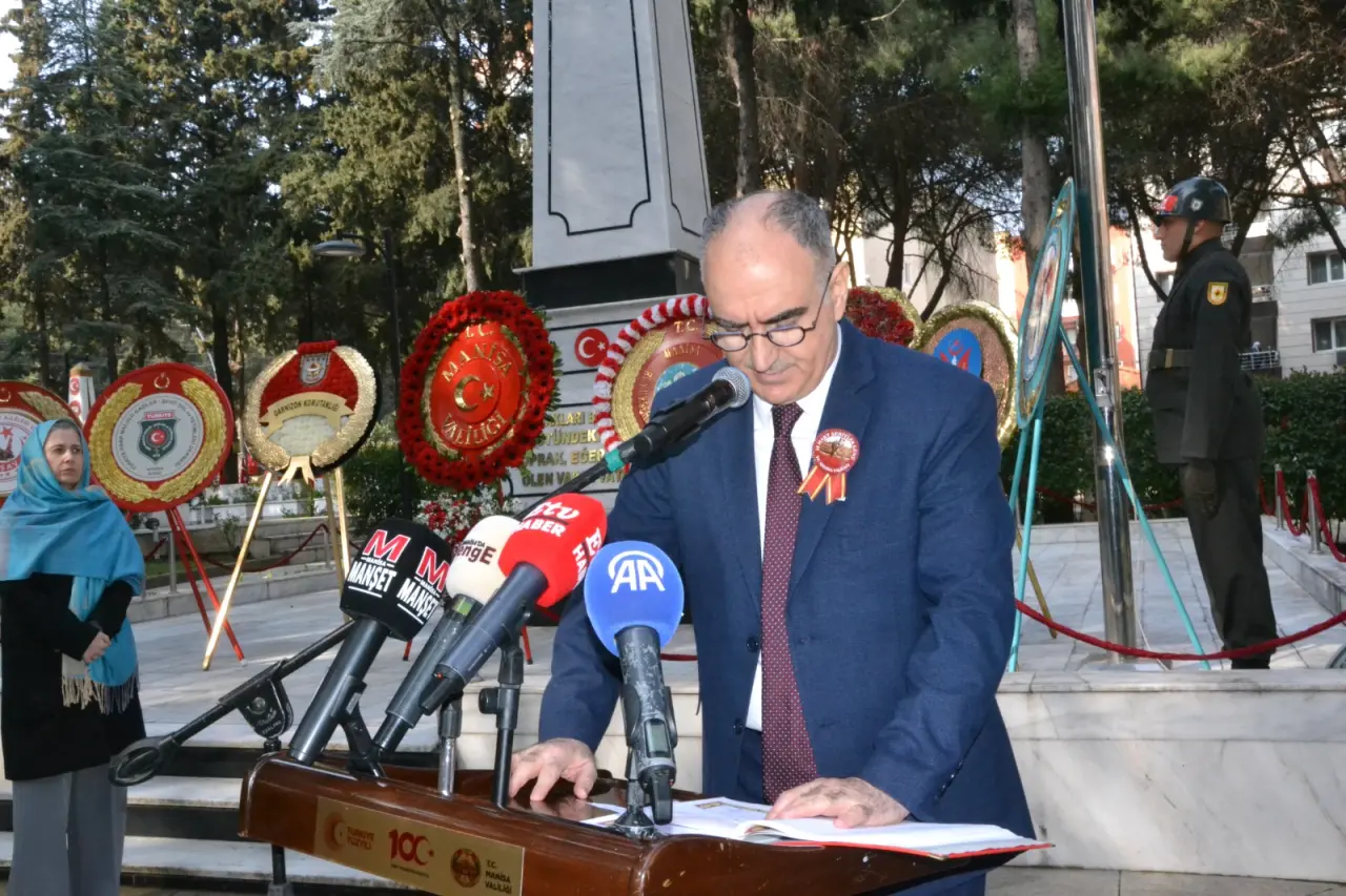 Vali Vahdettin Özkan, Garnizon Komutanlığı, Büyükşehir Belediye Başkanlığı ve Türkiye Harp Malulü Gaziler Şehit Dul ve Yetimleri Derneği Manisa Şube Başkanlığı, Türkiye Muharip Gaziler Derneği Manisa Şubesi Başkanlığı, Manisa Şehit Aileleri Koruma ve Kalkındırma Derneği Başkanlığı, Türkiye Şehit Aileleri ve Gaziler Vakfı Manisa Şube Başkanlığı ve Manisa Şehit Aileleri ve Gaziler Derneği anıta çelenk sundu. Askerler tarafından 3 el saygı atışı yapıldı. 1 dakikalık saygı duruşunda bulunuldu, İstiklal marşı okundu.