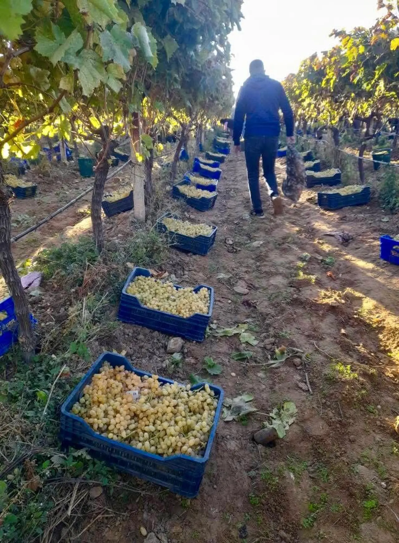 2025 yılı çekirdeksiz Sultaniye üzüm bağlarında hasat yoğun bir şekilde devam ederken, kesimi tamamlanan bağlardaki koruyucu örtüler de toplanmaya başlandı.