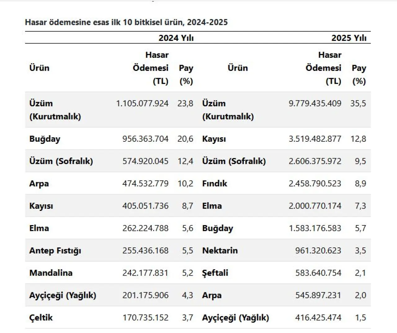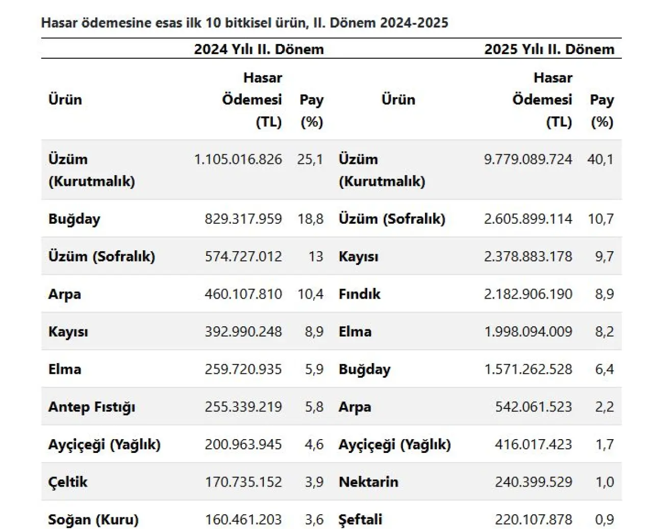 2025 yılında hasar ödemesine esas ürünler arasında 1. sırada yüzde 35,5’lik pay ile üzüm (kurutmalık), 2. sırada yüzde 12,8‘lik pay ile kayısı ve 3. sırada yüzde 9,5’lik pay ile sofralık üzüm geldi. 2024 yılında da yüzde 23,8 pay ile yine üzüm (kurutmalık) ilk sırada yer almıştı.