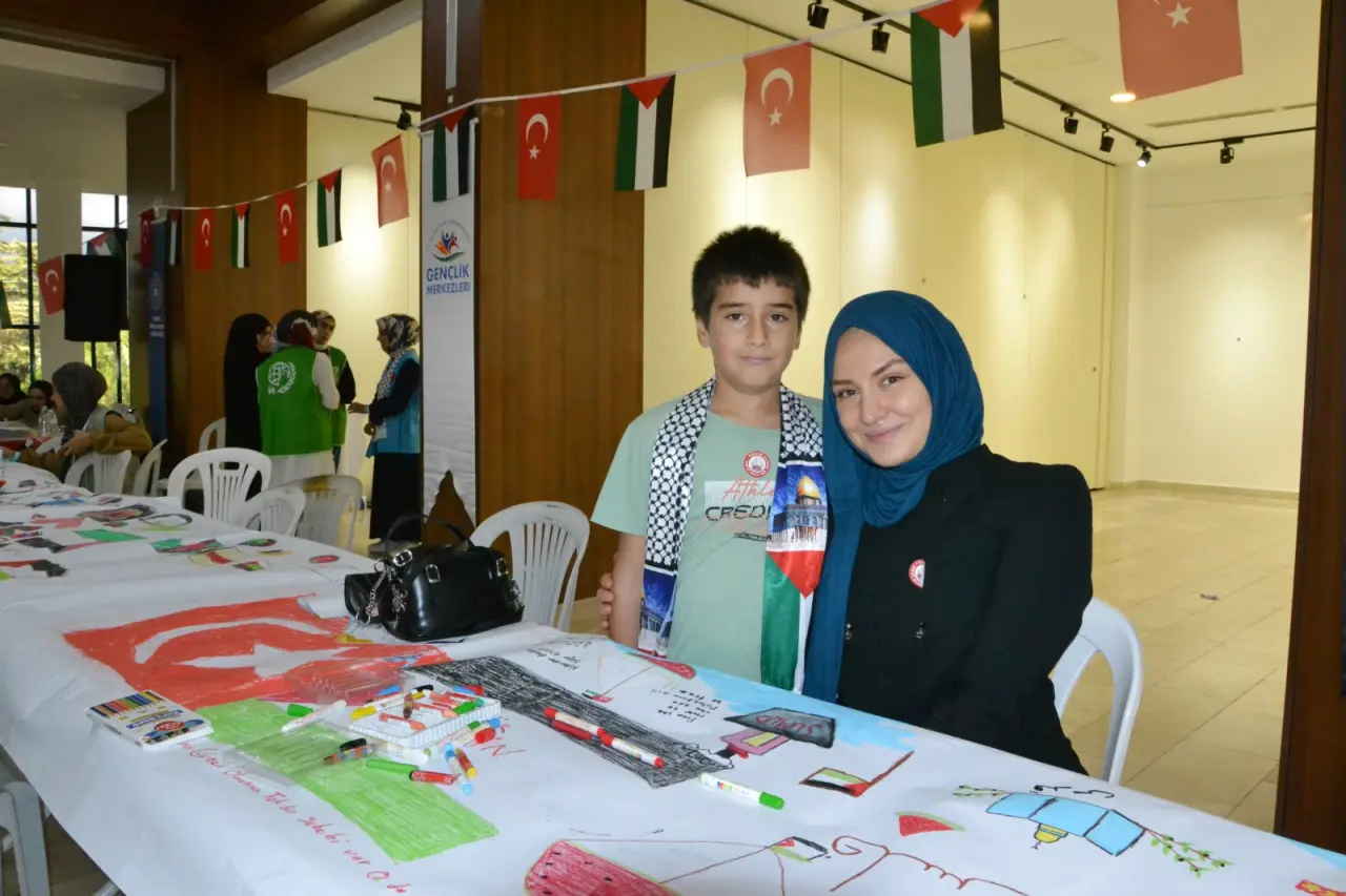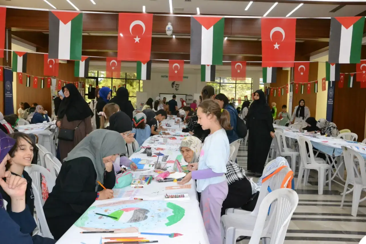 Filistinli çocukların, annelerin ve zulüm altındaki tüm kardeşlerimizin sesini duyurmak için bu etkinliği gerçekleştirdiklerini vurgulayan Mehmet Resul Çat, “Malumunuz olduğu üzere vicdanlı insanların yine insanlık için ayağa kalkmalarının bir tezahürü olarak “Sumud konvoyu” harekete geçmişti. Sumud; kararlılık, sarsılmazlık anlamına gelmektedir. Tam da ihtiyaç duyduğumuz şey! 40’dan fazla ülkeden 600’e yakın güzel insan 50 civarı gemiyle bu hayasız saldırıya dur demek üzere yola çıkmışlardı. Fakat sizlerin de takip ettiği gibi ahlaksız saldırılarla, tıpkı bir korsan gibi tüm insanları kaçırdılar, gemilerine el koydular. Oysa insani yardımların dokunulmazlığı bulunmaktadır. Her ne kadar gemiler fiziken Gazze’ye ulaşamasalar da gönül dünyasında ve insanlık vicdanında Gazze’ye ulaşmıştır. Rabbim işgalci organizasyonun yıkılışına ve kardeşlerimizin kurtuluşuna vesile eylesin inşallah. Bugün, 2 milyarlık İslam âleminin ve 8 milyarlık dünya nüfusunun cevap vermesi gereken tek soru şudur: 18 yıldır havadan, karadan ve denizden abluka altında tutulan Gazzeli çocuklara, annelere nefes alabilecekleri bir koridor açabilecek miyiz? Bizler, bu saldırılara ve hak ihlallerine karşı asla susmayacağız. Çünkü biliyoruz ki zulme rıza, zulümdür. Nitekim Peygamber Efendimiz (sav): “Kim bir kötülük görürse eliyle değiştirsin. Şayet eliyle değiştirmeye gücü yetmezse diliyle değiştirsin. Buna da gücü yetmezse kalbiyle buğz etsin ki, bu imanın en zayıf derecesidir.” buyurmaktadır. Artık ekranlarda kolsuz, bacaksız bırakılan çocukları; kucağında şehit olmuş evladını taşıyan anneleri; çaresiz yaşlı insanları izlemenin ötesine geçmeli; zalim İsrail ve yandaşlarına karşı daha etkili boykotlar yapmalı ve kararlı adımlar atmalıyız. Bugün burada, Filistinli çocukların, annelerin ve zulüm altındaki tüm kardeşlerimizin sesini duyurmak; onların haklarının teslim edilmesi ve bu zalimce saldırıların sona ermesi için “Filistinli Çocuklar İçin Çiz” etkinliğinde bir araya geldik. Çocuklarımız ve gençlerimiz, dualarını, temennilerini ve zalimlere karşı duruşlarını tuvallerine resmetti. Rabbimizden niyazımız, bu zulüm ve işgalin en kısa zamanda son bulmasıdır. Temennimiz yalnızca Filistinli çocukların değil; Doğu Türkistan, Afganistan, Keşmir, Arakan, Ukrayna, Sudan ve Yemen’deki bütün çocukların özgürce oynayacakları, kendilerini güven içinde hissedecekleri günlere kavuşmasıdır. Bu anlamlı etkinliğe katılan bütün STK’lara, gönüllülere ve kardeşlerimize teşekkür ederiz” diye konuştu.