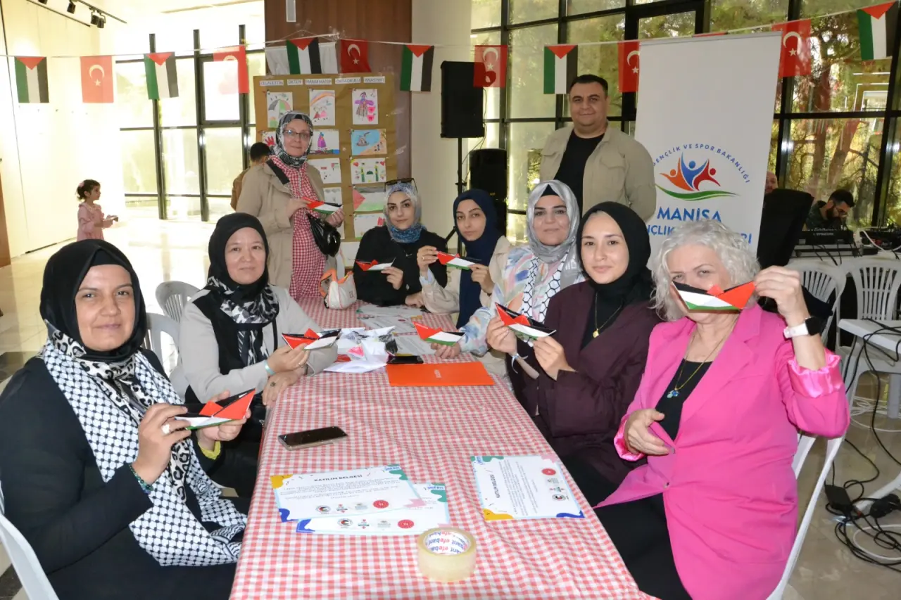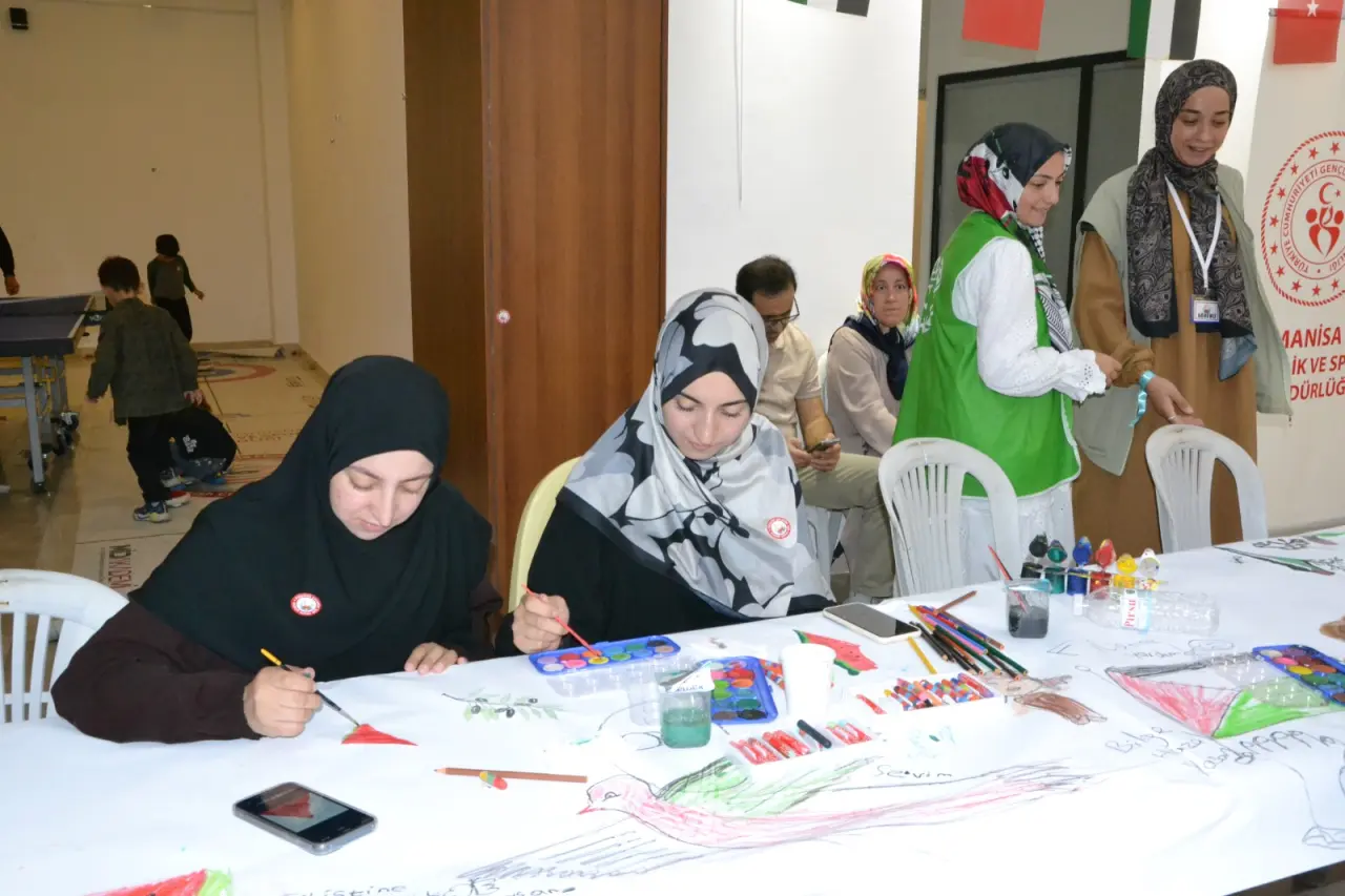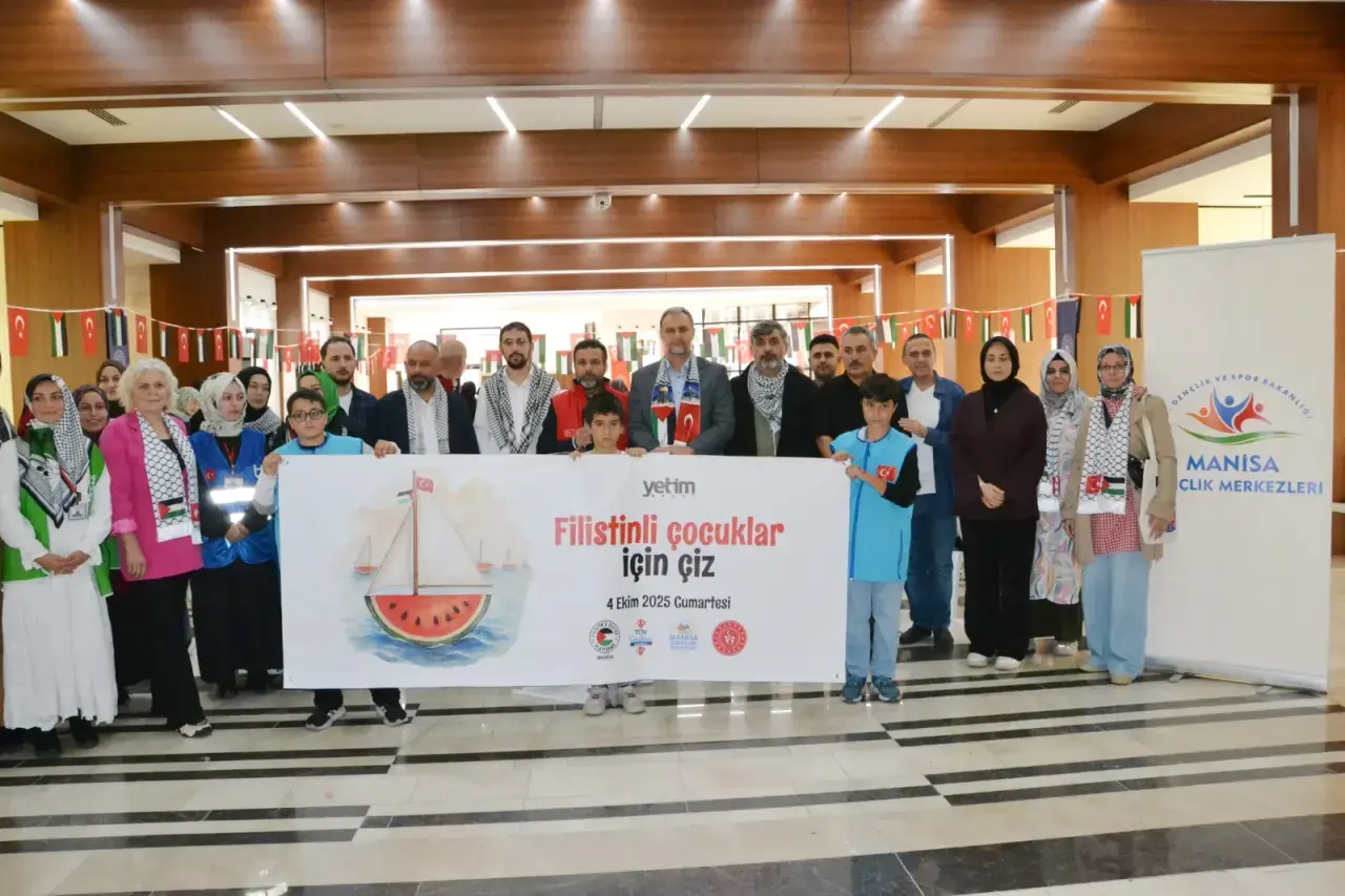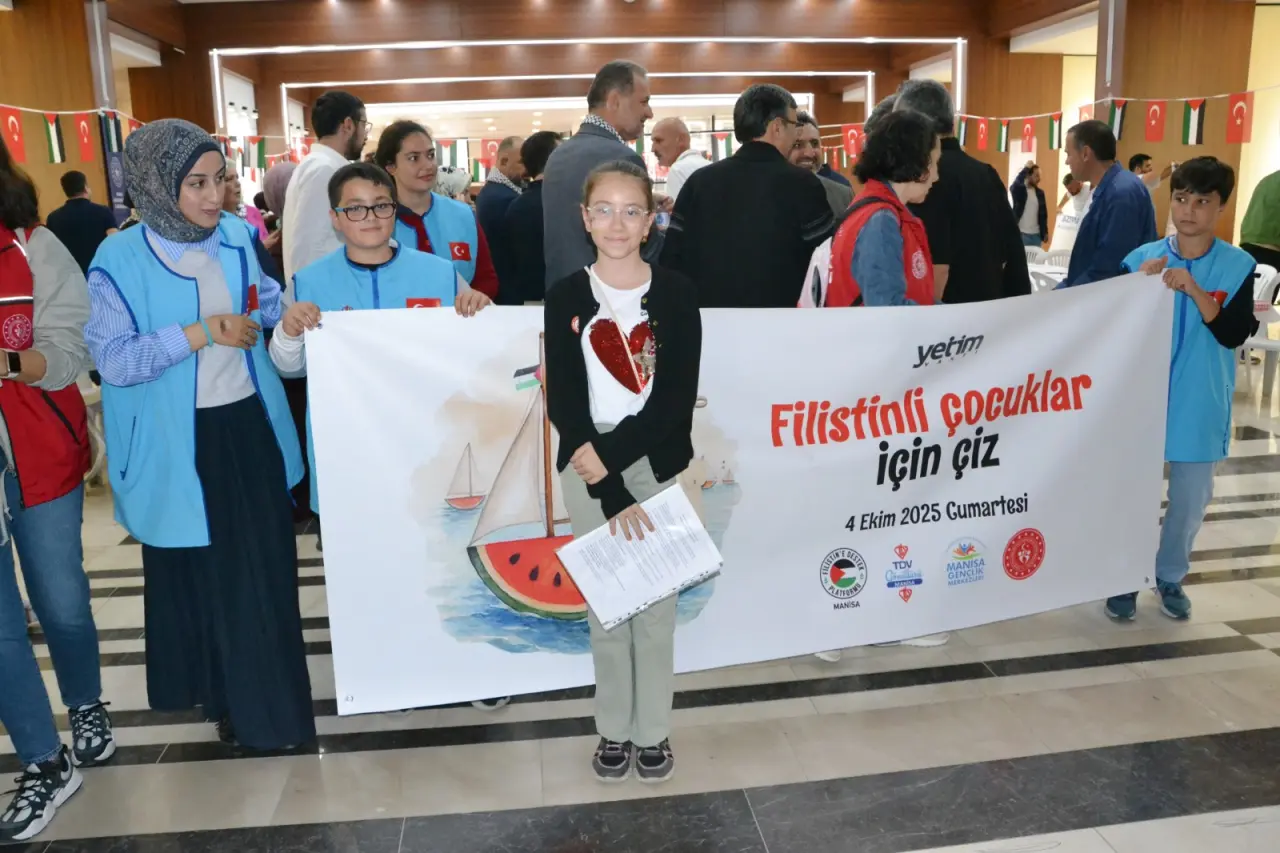 Manisa’da Filistin’e Destek Platformu öncülüğünde Filistin’de, Gazze’de çocuklara destek olmak amacıyla ‘Filistinli Çocuklar için çiz’ etkinliği gerçekleştirildi. Fatih Sergi Salonunda gerçekleşen etkinlikte çocukların ve gençlerin katılımıyla Filistinli çocukların yaşadıkları ve hayalleri kâğıda döküldü. Filistin’e Destek Platformu Manisa Temsilcisi Muzaffer Yurttaş, Manisa Gençlik ve Spor İl Müdürlüğü, Yetim Vakfı, Manisa Diyanet Vakıf gönüllüleri destek verdi. Akhisar, Turgutlu, Saruhanlı’dan da çocuklar etkinliğe katılarak resim çizdi. Çizim yapan çocuklara katılım ve teşekkür belgesi verildi. Ney dinletisi, Kur’an-ı Kerim ve dualar okundu, şiirler ve marşlar söylendi. Burada yapılan resim ruloları İstanbul’a gönderilecek ve ileriki günlerde 81 ilden gelen rulolar birleştirilerek bir zincir oluşturularak bir program yapılacak. Çocuklar için resim çizen Ayşenur Sütçü, çocukların özgürce yaşaması için artık savaşların sona ermesi gerektiğini kaydetti.
