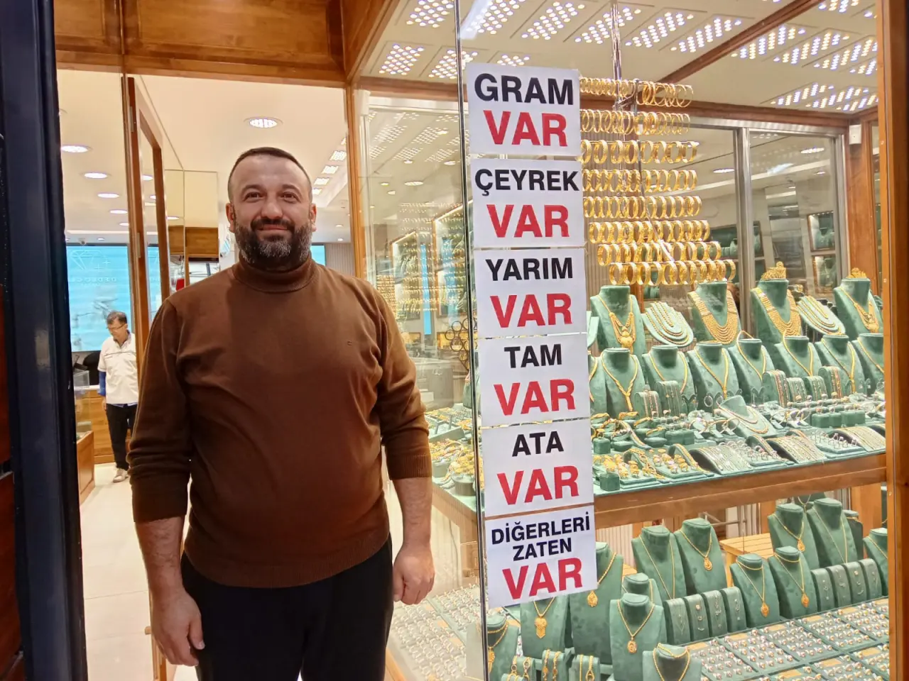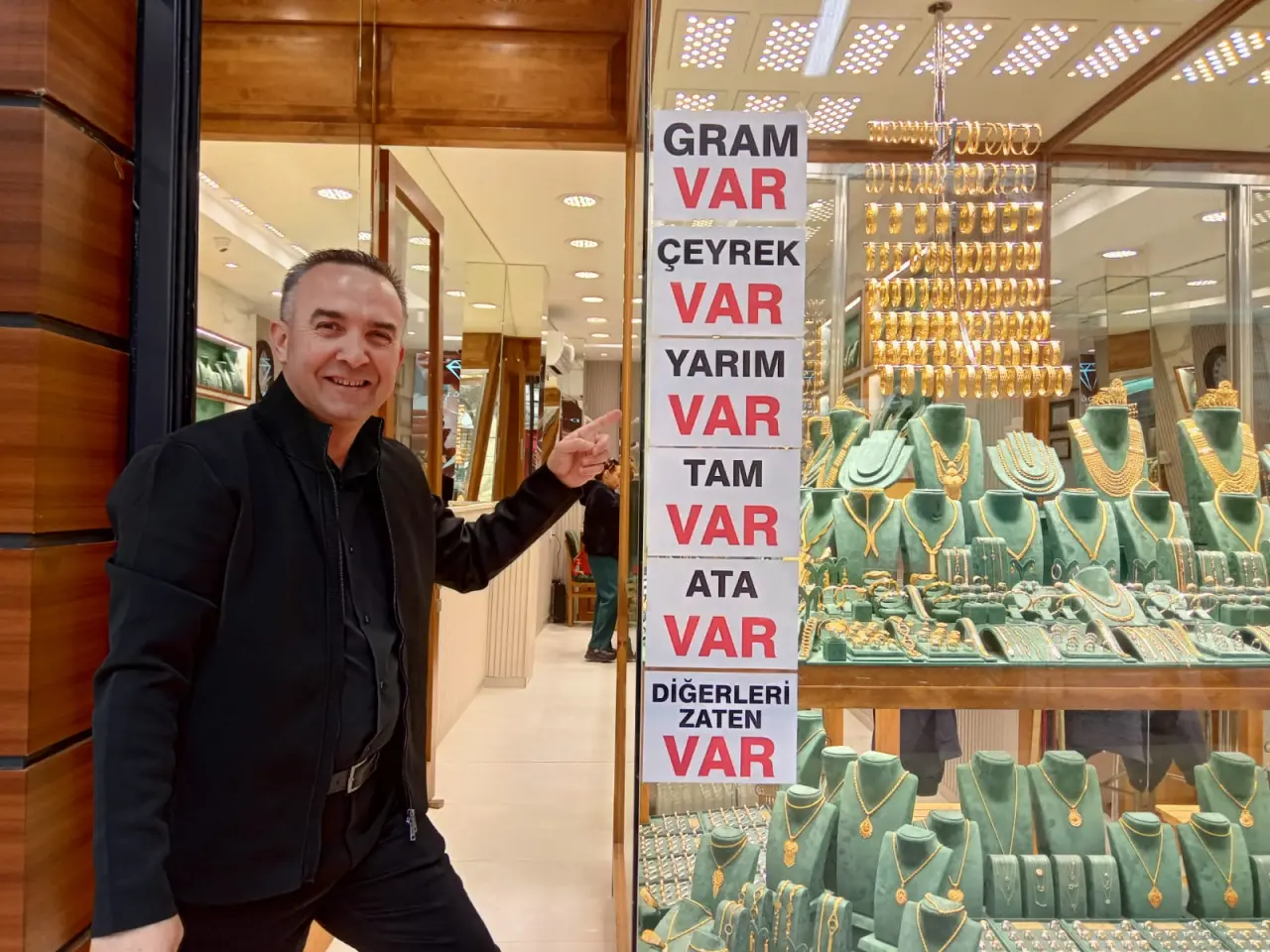 Manisa'da altın fiyatları bir iniyor bir yükseliyor. Altın fiyatları düşünce bazı kuyumcular altın satmamaya başladı. Fiyatlar yükselince altınlar ortaya çıktı. Bir kuyumcu ise cama "Çeyrek altın var yarım var tam altın var zaten hepsi var" afişi astı. Kuyumcu "İsmail Dedeoğlu, "Altın düşerken da vardı çıkarken de var. Bir esnaf olarak altın yok diyemem" dedi.