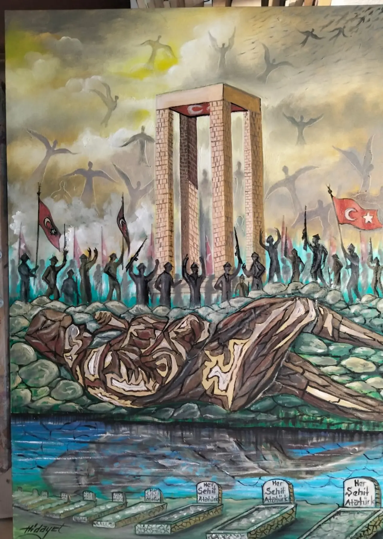 Tablonun ön planında yer alan parçalanmış insan figürü savaşın dramatik yönünü ortaya koyarken, fedakârlık ve bedel kavramlarını ön plana çıkarıyor. Alt bölümde bulunan mezar taşlarında yer alan “Her Şehit Atatürk” ifadesi ise, şehit olan her bireyin ulusal ideallerin temsilcisi olduğu düşüncesini vurguluyor. Bu yaklaşım, Mustafa Kemal Atatürk’ün bağımsızlık anlayışıyla ilişkilendiriliyor.