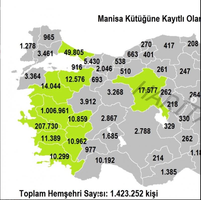 Türkiye İstatistik Kurumu (TÜİK)’in açıkladığı veriye göre 2023 yılında kütüğü Manisa’ya kayıtlı olup farklı şehirlerde yaşayan Manisalıların Türkiye haritası üzerinde yaşadıkları şehirler sıralandı.