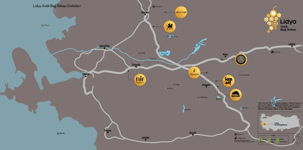 İç Ege’nin bereketli topraklarında 50’den fazla üzüm çeşidiyle üretim yapan bir grup bağcı, Lidya Antik Bağ Rotası adıyla yeni bir oluşuma imza attı.Lidya Antik Bağ Rotası’nda, Heraki, Kastro Tireli, Pendore, Nif, Selendi ve Sobran gibi üreticiler yer alıyor. Üreticiler bölgeyi sadece bir üretim merkezi değil aynı zamanda gastronomi ve kültür turizmi destinasyonu haline getirmeyi amaçlıyor. Lidya Antik Bağ Rotası Koordinatörü Ercan Boztepe, bölgenin tarihi ve turistik noktalarını da öne çıkarmak istediklerini kaydetti. Boztepe,Manisa'nın Kapadokyası olarak nitelenen Kuladokya, Karun Hazineleri'ne ev sahipliği yapan Uşak Müzesi, tarihte ilk Kral Yolu'nun başlangıcı Sardes Antik Kenti gibi pek çok önemli tarihi ve turistik noktayı gastronomi turizmi ile birleşeceğini belirtti.
