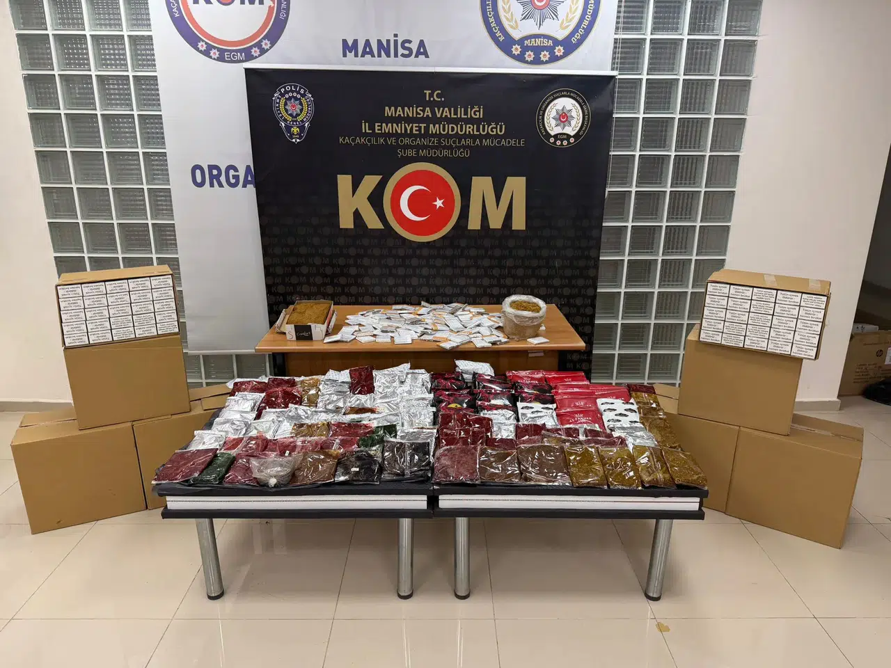 Sabahın erken saatlerinde eş zamanlı olarak gerçekleştirilen operasyonlarda, Turgutlu ilçesinde 6 şahsa ait 5 ikamet ve 3 iş yeri, Kırkağaç ilçesinde ise 1 iş yeri olmak üzere toplam 9 adreste arama yapıldı. Aramalar ve ara yakalamalar sonucunda, 407,5 kilogram açık kıyılmış tütün, 12 bin 940 adet içi doldurulmuş makaron, 127,7 kilogram nargile tütünü, 27 adet elektronik sigara likiti, 28 adet bandrolsüz sigara, 2 adet elektronik sigara, belge eksikliği bulunan 80 bin adet boş makaron ele geçirildi.