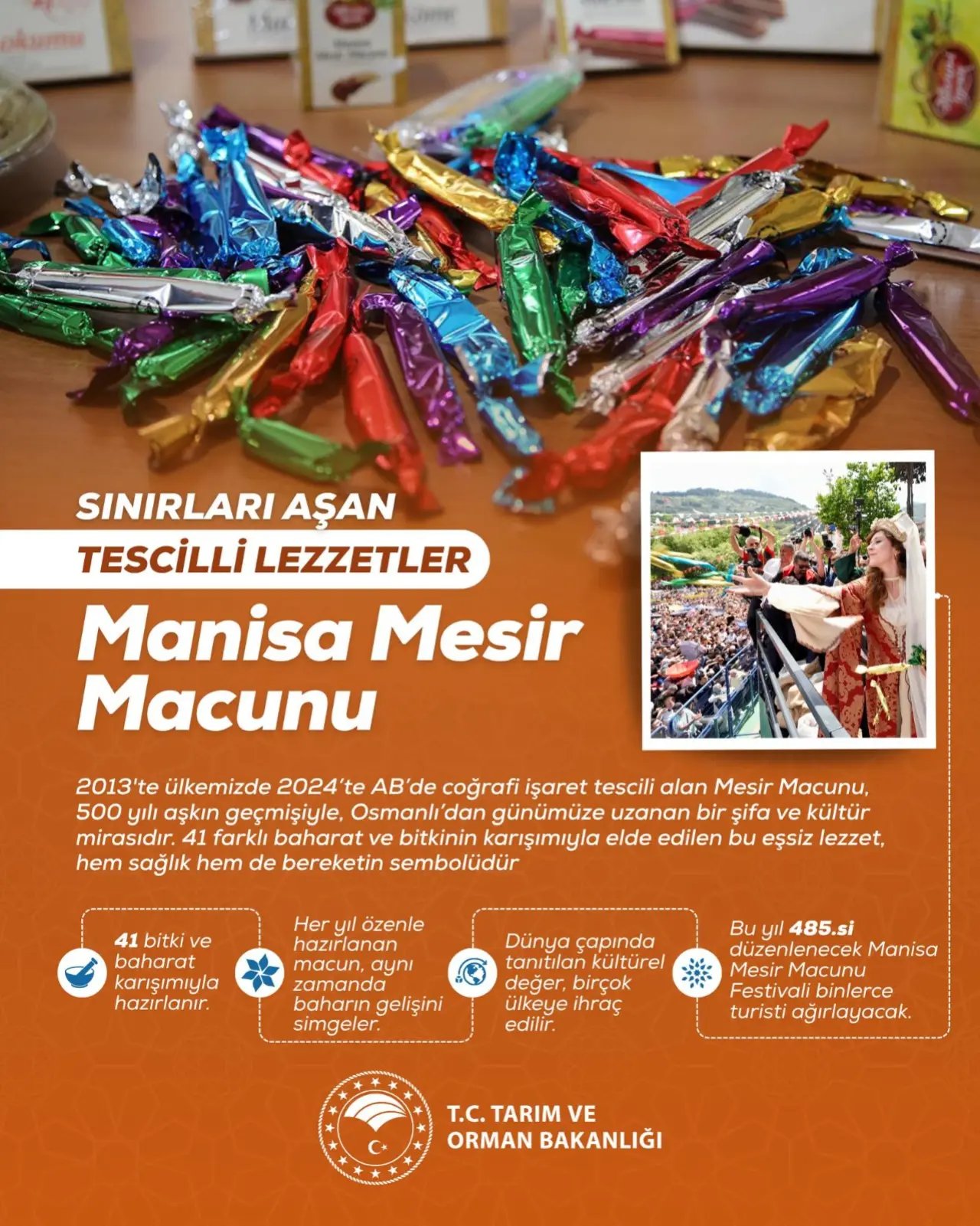 2013'te Türkiye’de, 2024'te ise AB'de coğrafi işaret tescili alan Mesir Macunu, 500 yılı aşkın geçmişiyle, Osmanlı'dan günümüze uzanan bir şifa ve kültür mirası olarak kabul ediliyor. 41 farklı baharat ve bitkinin karışımıyla elde edilen bu eşsiz lezzet, hem sağlık hem de bereketin sembolü. 41 bitki ve baharat karışımıyla hazırlanan mesir, her yıl özenle hazırlanıyor ve düzenlenen festivaller baharın gelişini simgeliyor. Dünya çapında tanıtılan kültürel bu değer, birçok ülkeye de ihraç ediliyor. 2026 yılında 486.si düzenlenecek Manisa Mesir Macunu Festivali binlerce turisti ağırlayacak.