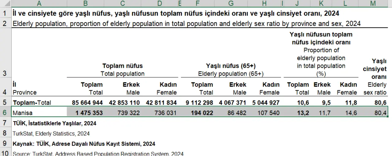 TÜİK verilerine göre Manisalı kadınlar, erkeklere göre daha fazla yaşıyor. Bu veriler ışığında, 2024 yılında 65 yaş üstü kadın sayısı 107 bin 540 iken erkek sayısı 86 bin 482 olarak kayıtlara geçti. Bu durum yaşlı cinsiyet oranını da etkiledi.