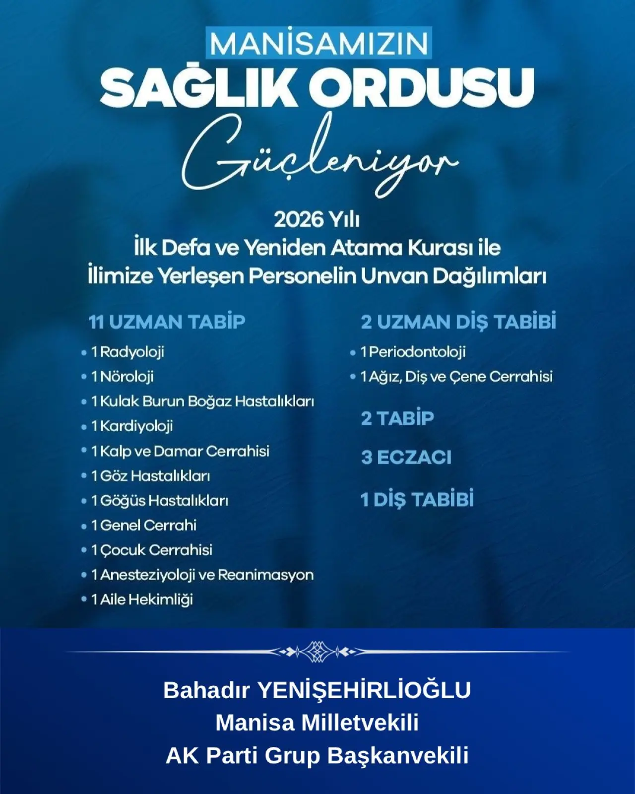 AK Parti Grup Başkanvekili ve Manisa Milletvekili Bahadır Yenişehirlioğlu, 2026 yılı İlk Defa ve Yeniden Atama Kurası kapsamında Manisa’ya yeni sağlık personellerinin kazandırıldığını açıkladı.