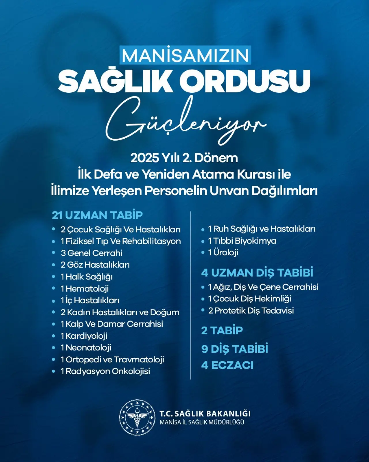 Yenişehirlioğlu, yaptığı açıklamada şu ifadelere yer verdi: “Cumhurbaşkanımız Sayın Recep Tayyip Erdoğan’ın liderliğinde, insanı merkeze alan hizmet anlayışının en güzel yansımalarından biri de sağlık alanında yaşanıyor. 2025 yılı 2. dönem atamalarıyla; 21 uzman tabip, 4 uzman diş tabibi, 9 diş tabibi, 2 tabip ve 4 eczacı daha Manisa’mıza kazandırıldı.