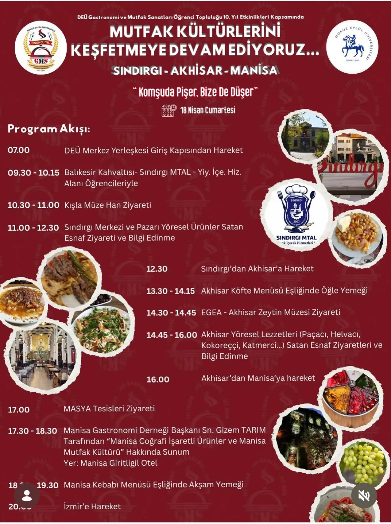 2 tonluk tencerede tarhana çorbası ve mesirli enginarlı bahar pilavının yapılacağını belirten Tarım, “Geçen yıl yapılan etkinlikte de tescilli ürünlere yer vermiştik. Manisa Büyükşehir Belediye Başkanı rahmetli Ferdi Zeyrek’in isteği bu yöndeydi. Gastronomiye çok önem veriyordu. O yüzden öyle bir başlangıç yaptık aslında. Kendimizi denedik diyebiliriz. Kendisi de orada yemek yaptı zaten bahar pilavı. Bu sene ona da yer vereceğiz inşallah. Manisa Büyükşehir Belediye Başkanı Besim Dutlulu katılacak. 2,5 metre çapında yani yaklaşık 2 tonluk bir tencere getirtiyoruz. 24 ve 25 Nisan'da bu dev tencerelerde bizim yemeklerimizi yapacağız. İlk gün yani 24'ünde bu dev tencerede 2 tonluk tencerede emcelli tarhanası yapacağız. Emcelli biberimiz bizim tescilli ve sadece bu tarhana için üretilen bir biber aslında. Onun hikayesi anlatıp, o büyük kazanda Emce ile tarhanasının bir şovu olacak. Bütün protokol, bizim yerel derneklerimiz, şefler hepsiyle birlikte orada hem görsel bir şov planlıyoruz hem de halka o tarhanayı dağıtıyoruz. 2000-2500 kişilik bir tarhana olacak. Mesirli enginarlı bahar pilavı yapmıştık, bu geleneksel hale getirmek istiyoruz. Mesir ve koruk suyumuz var bunun içinde. Bu pilavı da 2 tonluk dev tencerede yaparak halkımıza dağıtacağız. Manisa için oturumlarımız var. Güzel sektör temsilcileri bize eşlik edecek. Danilo şef, MasterChef All Star yarışmacılarından Danilo Zanla'ya, Erkan Can'dan Taylan Kümeli'ye gerçekten güzel ağırlayacağımız misafirlerimiz olacak. Gastronomi ülke gastronomisinden Manisa gastronomisine uzanan güzel bilgilendirici sohbetlerimiz olacak. O isimleri de ağırlamış olacağız sahnede” dedi.