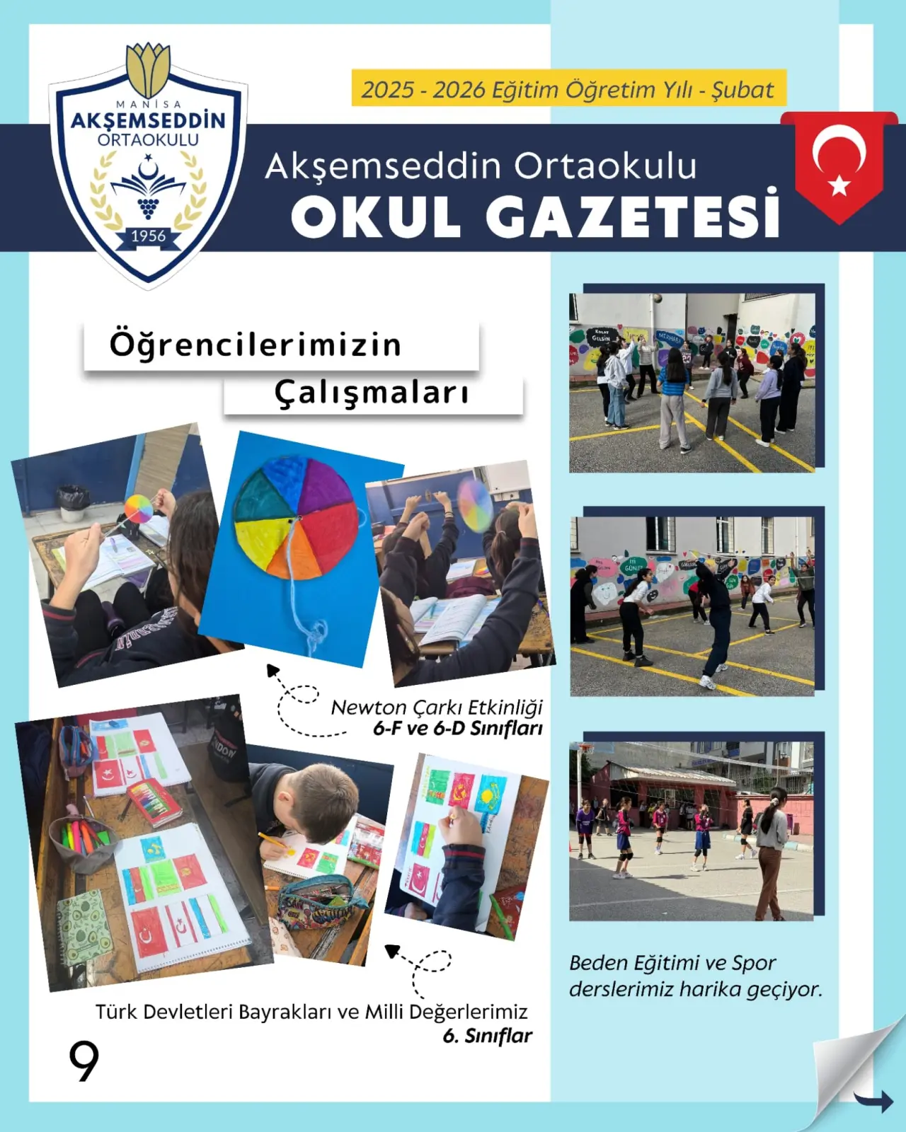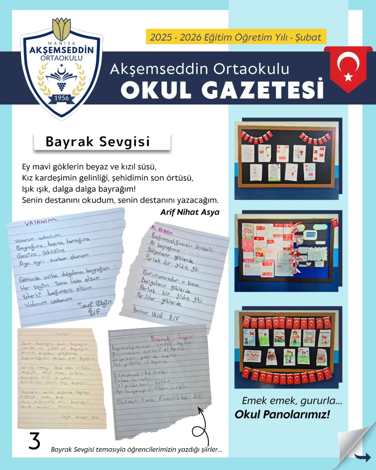Manisa'da faaliyet gösteren Akşemseddin Ortaokulu, öğrencilerin yazma, düşünme ve üretme becerilerini geliştirmek amacıyla aylık dijital okul gazetesi projesini hayata geçirdi. Tamamen öğrenci emeğiyle hazırlanan gazetede şiirler, hikâyeler, özgün fikir yazıları ve öğrencilerin yaptığı resimler yer aldı. Okul içi etkinlikler, pano çalışmaları ve projeler de gazetenin sayfalarında geniş yer buldu.