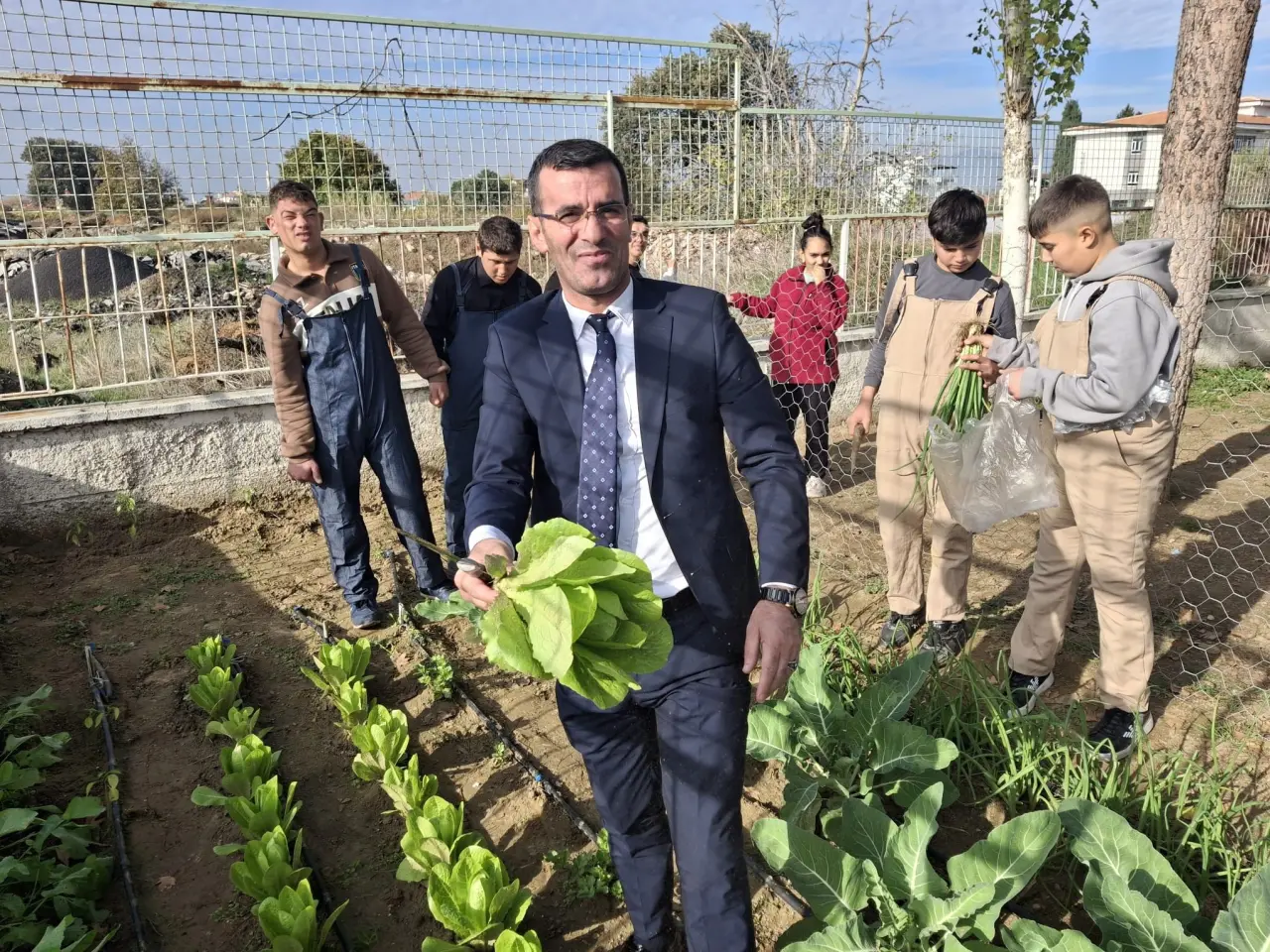 Ziyarette Özel Eğitim Sınıfı Tarım Alanı öğrencilerinin uygulama bahçesinde yetiştirdikleri ürünlerin hasadı protokol üyeleri ve öğrenciler tarafından birlikte gerçekleştirildi.