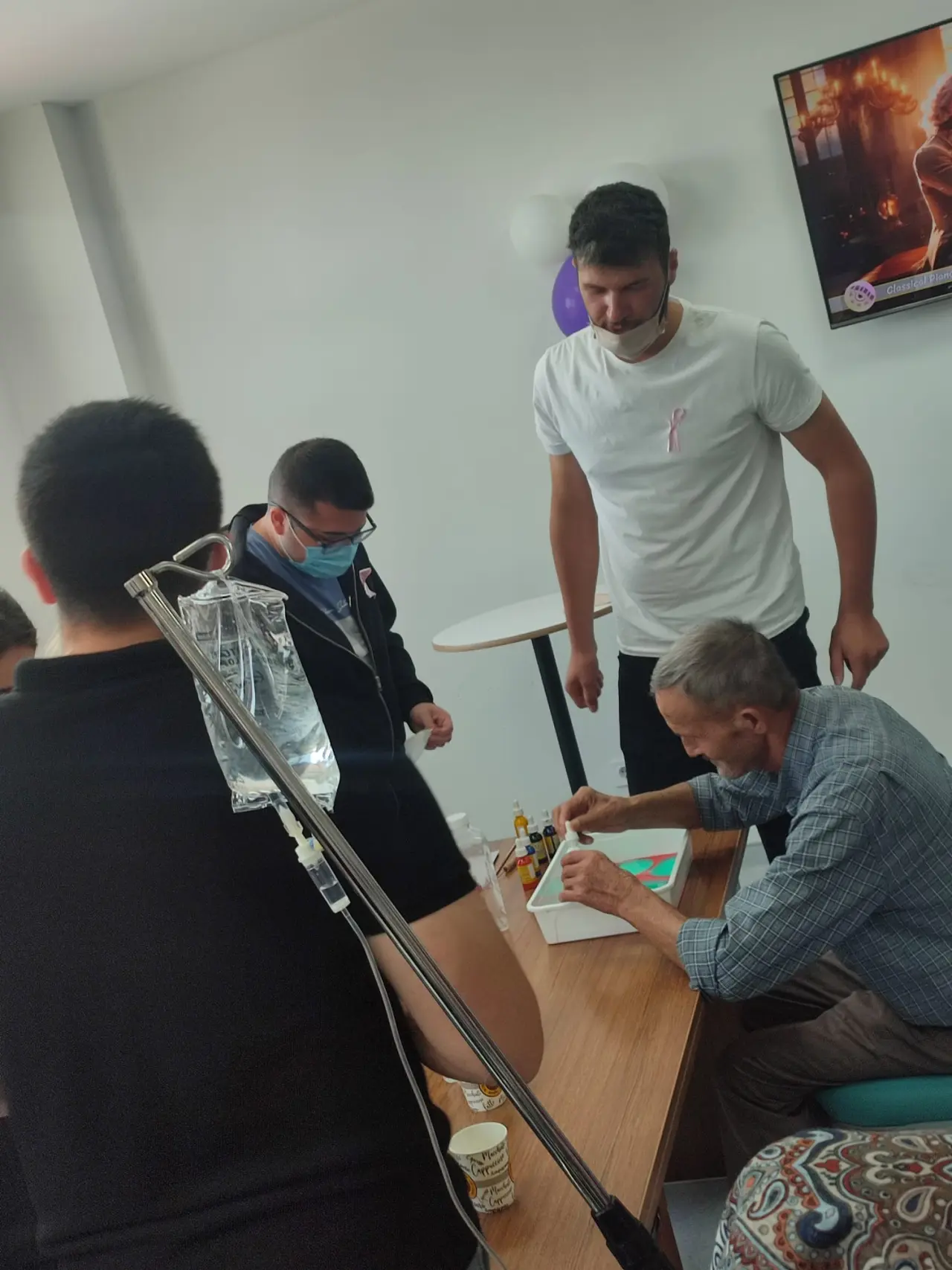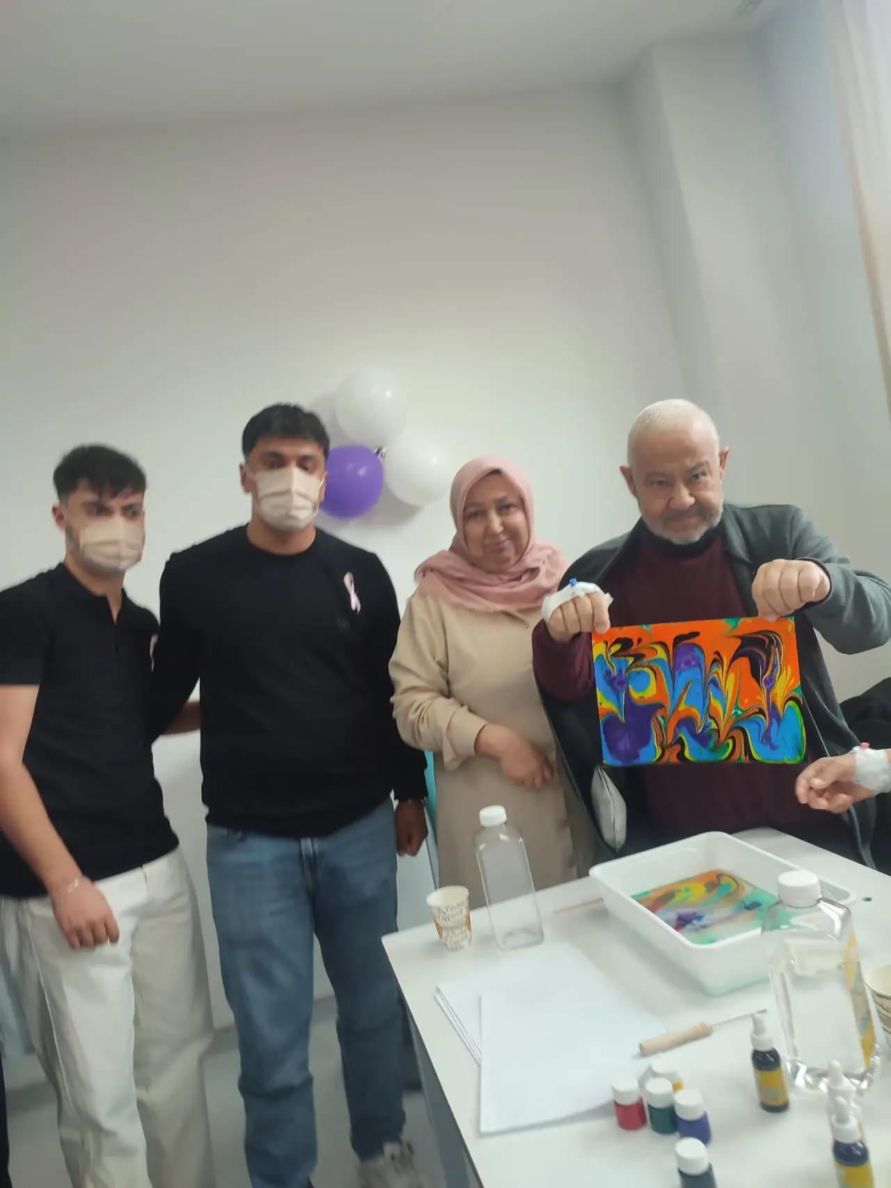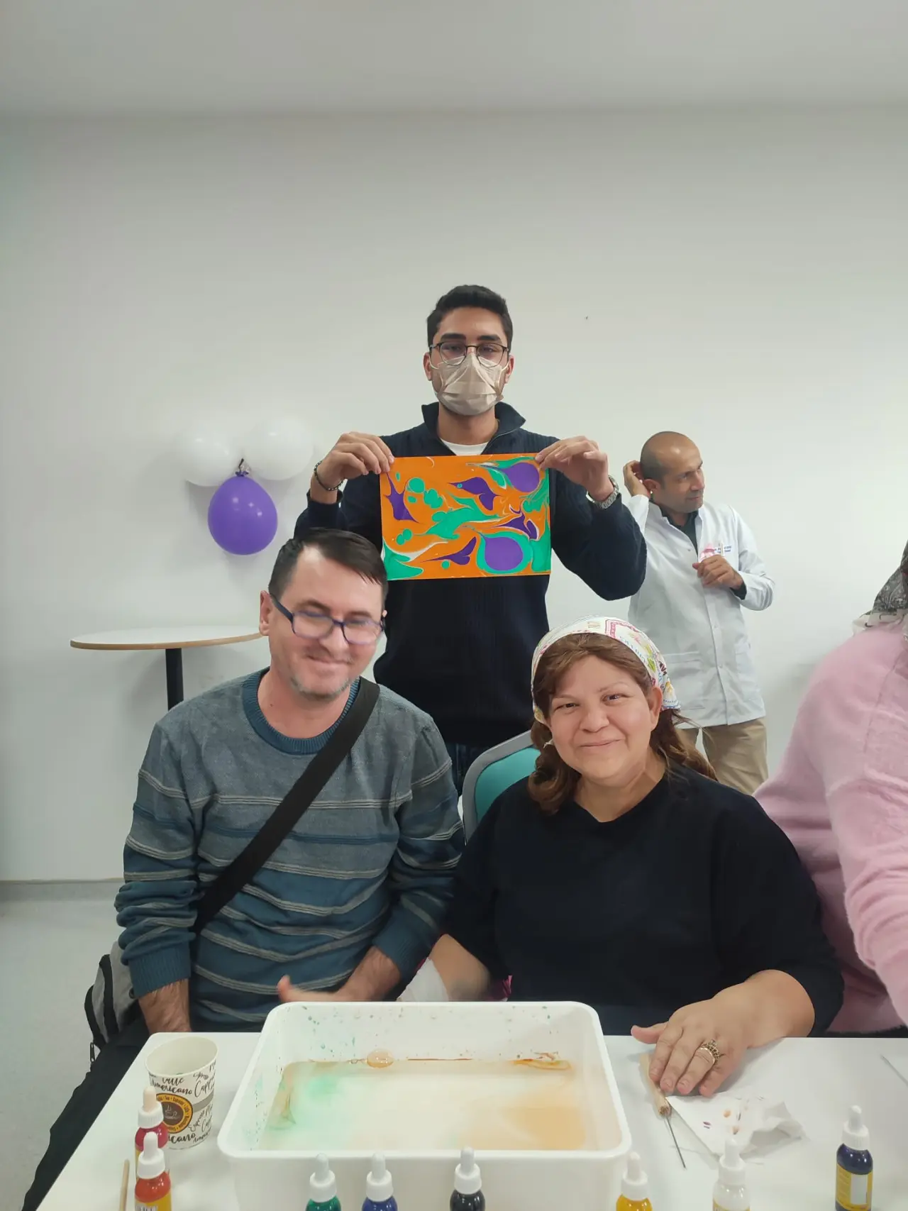 Hafsa Sultan Hastanesi Onkoloji Ek Hizmet Binası 2. Kat Çok Amaçlı Salon'da gerçekleştirilen ebru etkinliği, sanatın terapi edici yönünü bir kez daha gözler önüne serdi. Öğrencilerin rehberliğinde suyun üzerinde renklerin dansıyla ortaya çıkan eserler, hastaların zorlu süreçlerinde bir nebze olsun huzur bulmalarına yardımcı oldu.