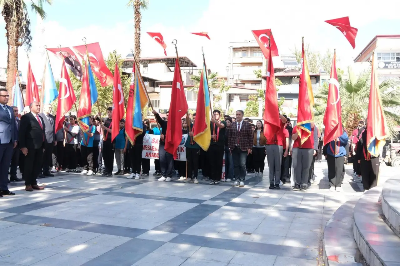 Törende, saygı duruşunda bulunulmasının ardından İstiklal Marşı okundu. Ardından Kaymakam Halil Dalak, Belediye Başkanı Tahsin Akdeniz ve ilçe protokolü, Atatürk Anıtı’na çelenk sundu.