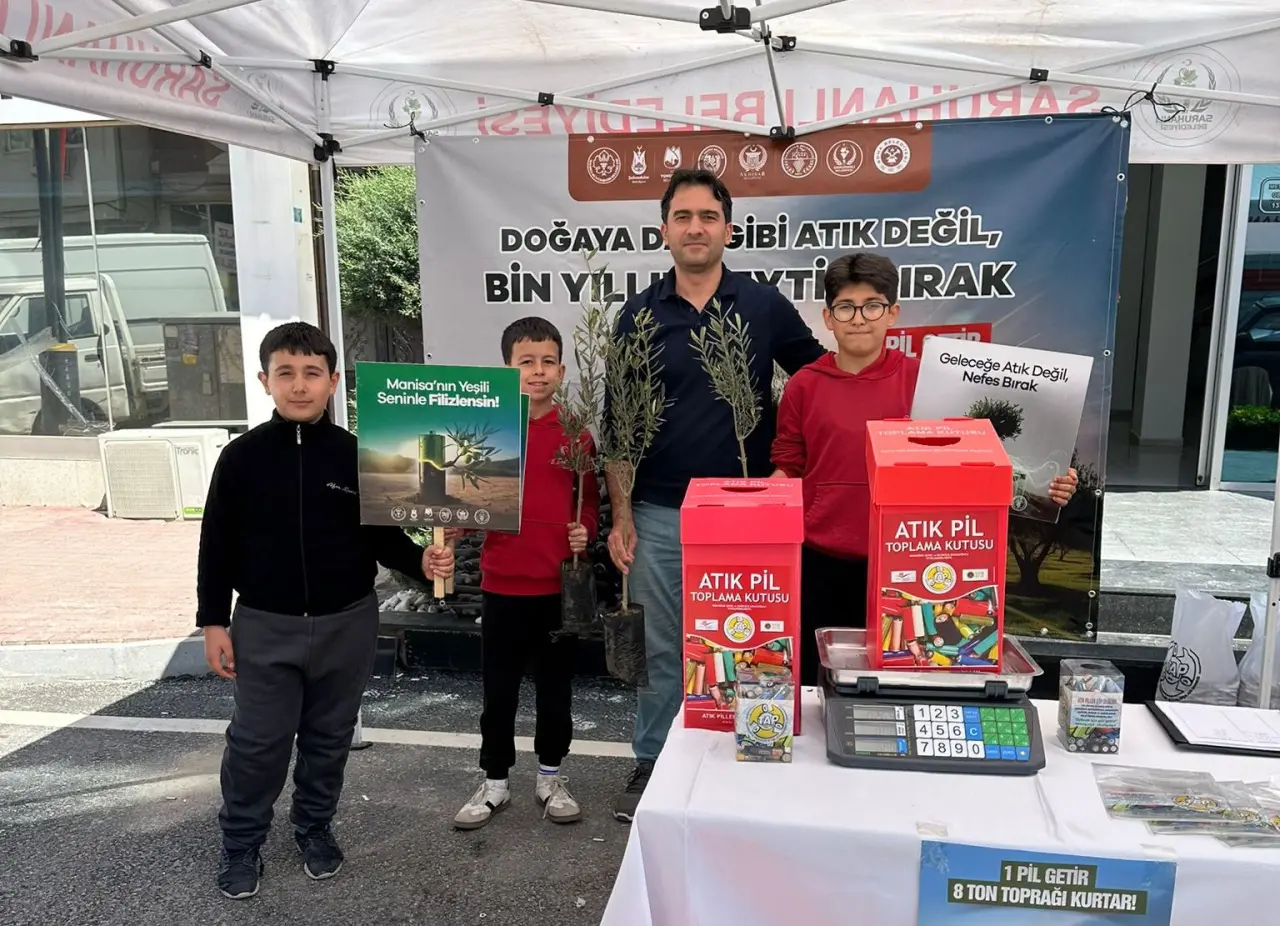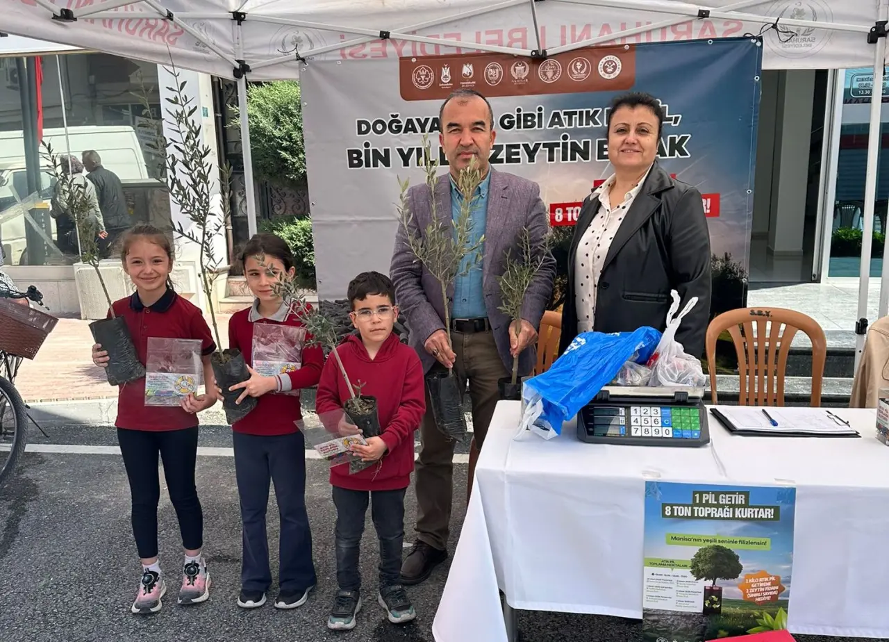 Saruhanlı Belediyesi İklim Değişikliği ve Sıfır Atık Müdürlüğü tarafından yürütülen etkinlikte, çevre bilincini artırmak amacıyla 1 kilogram atık pil getiren vatandaşlara zeytin fidanı hediye edildi.