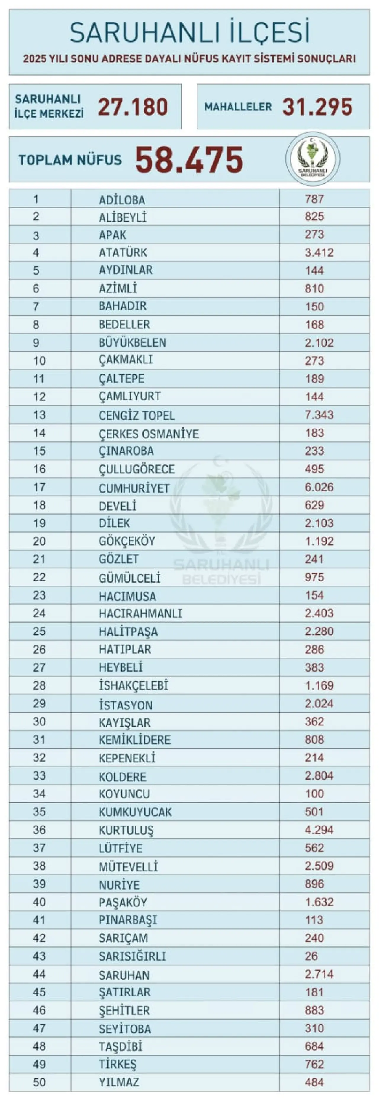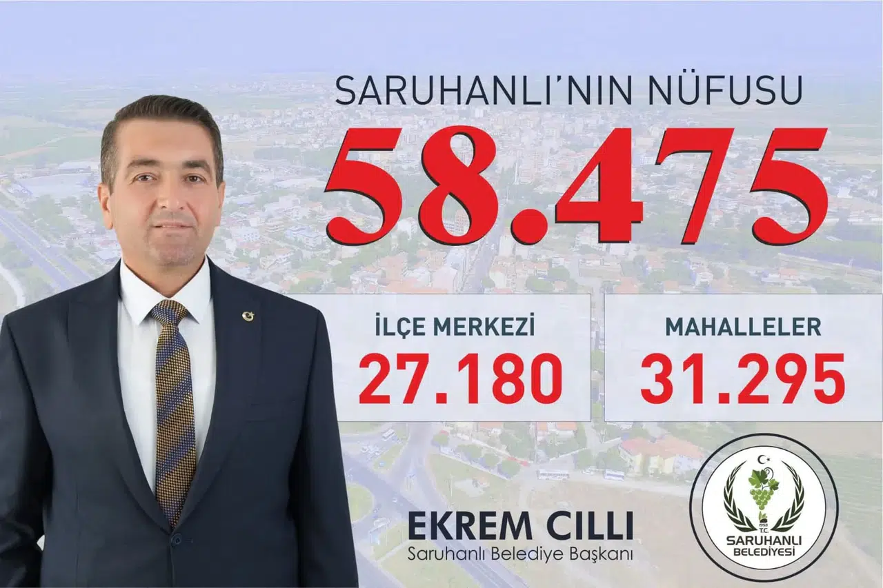 Türkiye İstatistik Kurumu’nun (TÜİK) 2025 yılı Adrese Dayalı Nüfus Kayıt Sistemi sonuçlarına göre, Saruhanlı’nın ilçe merkezinin nüfusu geçen yıla oranla bin 129 kişi artarak 27 bin 180 oldu. İlçe merkezi dışında kalan 42 kırsal mahallenin toplam nüfusu ise 589 kişi azalarak 31 bin 295’e geriledi.