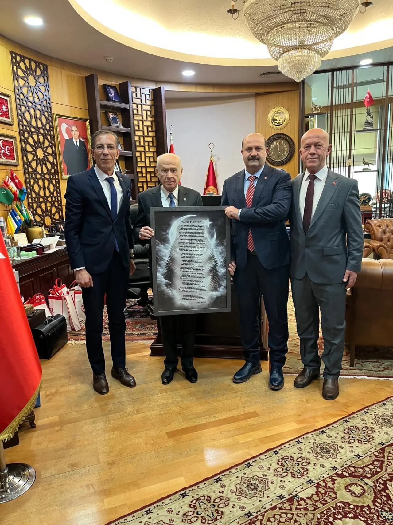 MHP Şehzadeler İlçe Başkanı Şener Özten ve ilçe yöneticilerinden Osman Keçici’nin de yer aldığı heyet, Ankara’da gerçekleştirilen temaslar kapsamında, Genel Başkan Devlet Bahçeli ile MHP Grup Başkanvekili ve Manisa Milletvekili Erkan Akçay ile bir araya geldi. Gerçekleştirilen ziyarette Şehzadeler ilçesinin güncel sorunları, yerel ihtiyaçlar ve ilçe teşkilat çalışmalarına ilişkin konular ele alınarak karşılıklı görüş alışverişinde bulunuldu. Heyette yer alan, asıl mesleği Türk dili ve edebiyatı öğretmeni olan ve halen Manisa Valiliği Yatırım İzleme ve Koordinasyon Başkanlığı Rehberlik ve Denetim Müdürü olarak görev yapan Hilmi Polat’ın ise kaleme aldığı “Tarih Türktür” adlı şiiri, her iki ziyarette de Devlet Bahçeli ve Erkan Akçay’a takdim edildi.