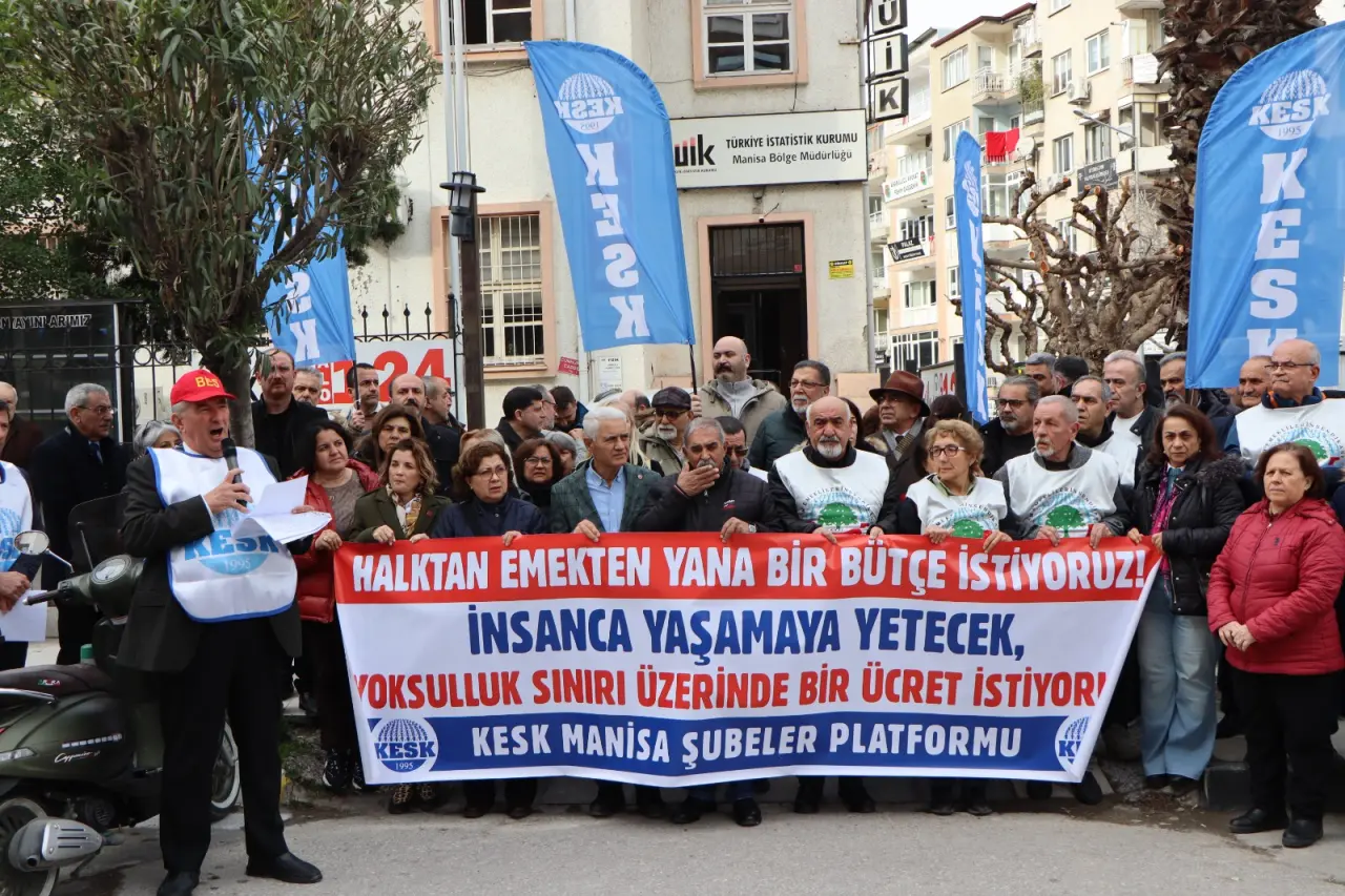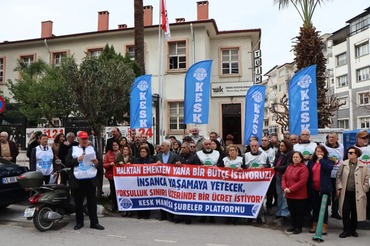 Manisa’daki emekliler Türkiye İstatistik Kurumu (TÜİK) önünde bir araya gelerek 2026 yılı için açıklanan 18 bin 938 lira emekli maaşını protesto etti. Kamu Emekçileri Sendikaları Konfederasyonu (KESK) Manisa Şubeler Platformu adına Bireysel Emeklilik Sistemi (BES) Şube Başkanı Ufuk Doruk öncülüğünde düzenlenen protestoda “TÜİK yalanlarına, yoksulluğa teslim olmayacağız! İnsanca bir yaşam için 14 Ocak’ta iş bırakıyoruz!” sloganları atıldı. Doruk, yaptığı açıklamada, İstanbul Ticaret Odası’nın (İTO) açıkladığı yıllık enflasyon oranının yüzde 37,68 olduğunu dile getirerek diğer enflasyon araştırma gruplarında bu oranların yüzde 56,17’ye kadar çıktığı vurguladı. Açıklanan asgari ücretin, TÜİK’in açıkladığı enflasyon oranının bile altında kaldığını belirten BES Şube Başkanı Ufuk Doruk, “TÜİK bugün 2025 yılı enflasyonun yüzde 30,89 olduğunu açıkladı. Ama asgari ücreti 10 gün önce yüzde 27 artırarak, açlık sınırının altında tuttular. TÜİK’in gerçekleşen enflasyon verileri dahi temel alınmış olsaydı bugün asgari ücretin 32 bin165 TL olması gerekiyordu. Dolayısıyla TÜİK’in sahte enflasyon verilerine göre bile her asgari ücretlinin aylık 4 bin 100 TL’sine yıllık ise 49 bin 200 TL’sine, yani yaklaşık 2 aylık ücretine el konulmuştur” dedi.