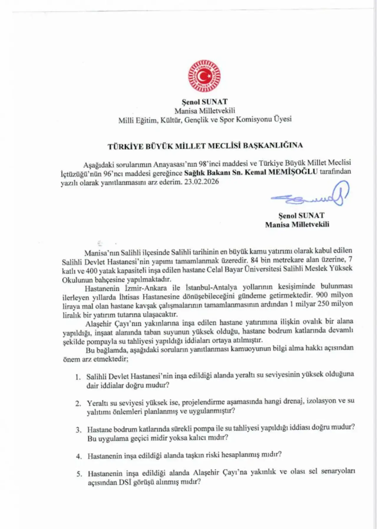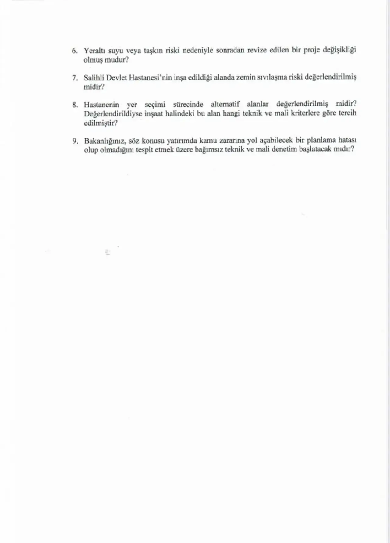 Sunat soru önergesinde, inşaat alanında taban suyunun yüksekliğinden su yalıtım önlemlerine, hastanenin yer seçimi sürecinden olası taşkın riskine kadar teknik planlamaya ilişkin birçok başlıkta Bakanlıktan cevap istedi.