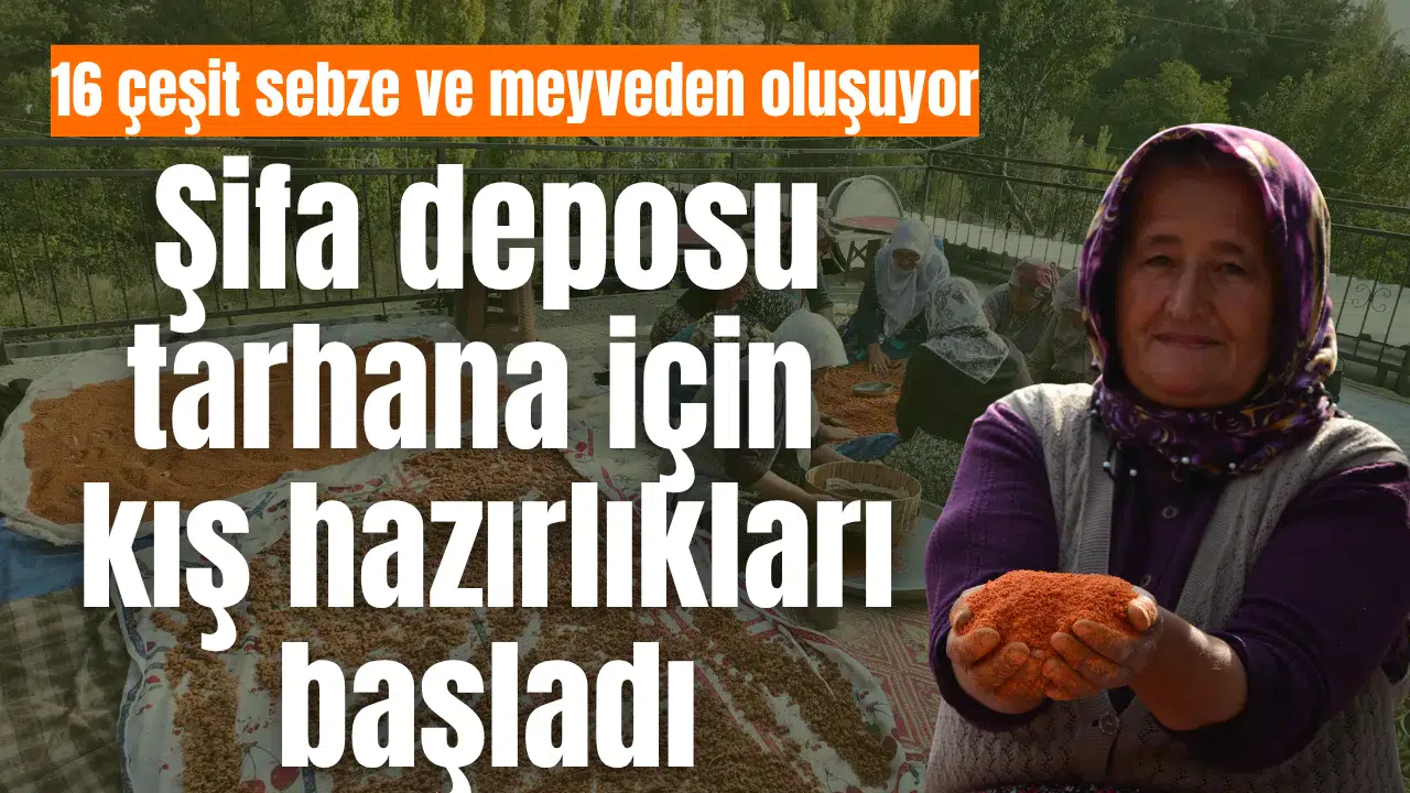 Kırmızı biber, domates, nohut ve fasulyenin yanı sıra sarımsak, soğan, patates, patlıcan, kabak, alıç, kuşburnu, kızılcık, ayva, elma, nane ve maydanoz gibi 16 çeşit meyve ve sebzenin kullanıldığı tarhananın harcı odun ateşinde hazırlanıyor. Odun ateşinde pişirilen tarhana harcı bir gün bekletildikten sonra hamurla 16 gün boyunca her gün yoğruluyor. 16'ıncı günün sonunda tarhana harcı parçalara bölünerek bez üstüne serilmesinin ardından kurutulmaya bırakılıyor. Kurutulan tarhanalar ufalanarak toz haline getirilerek, elekten geçirilip bir süre bekletildikten sonra hazır hale geliyor.