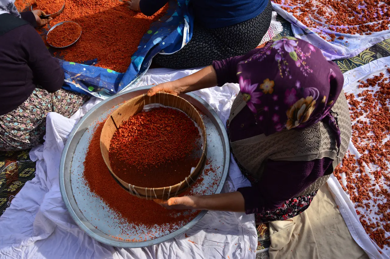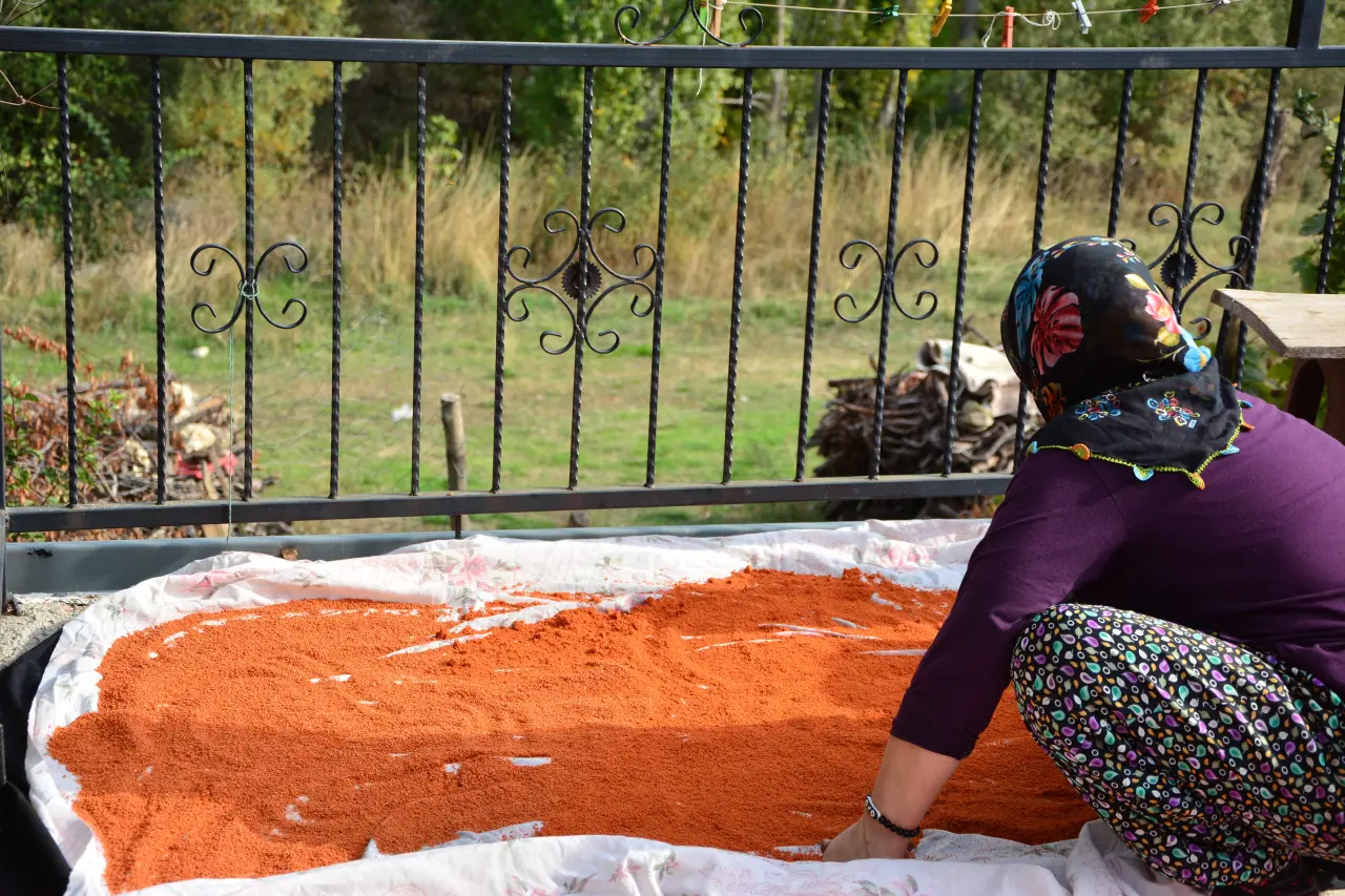 İlçeye bağlı Akdere Mahallesinde kadınlar kış mevsiminin yaklaşması ile kışlık olarak tüketilecek ürünleri imece usulü ile el birliği halinde hazırlıyorlar.