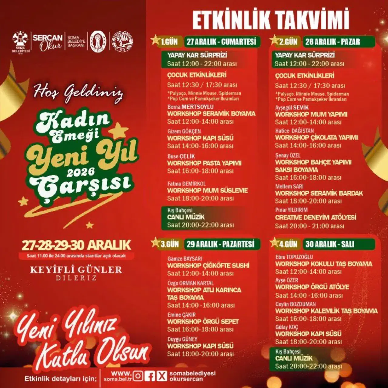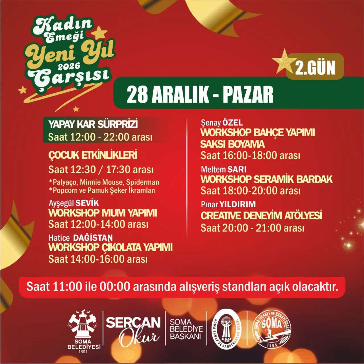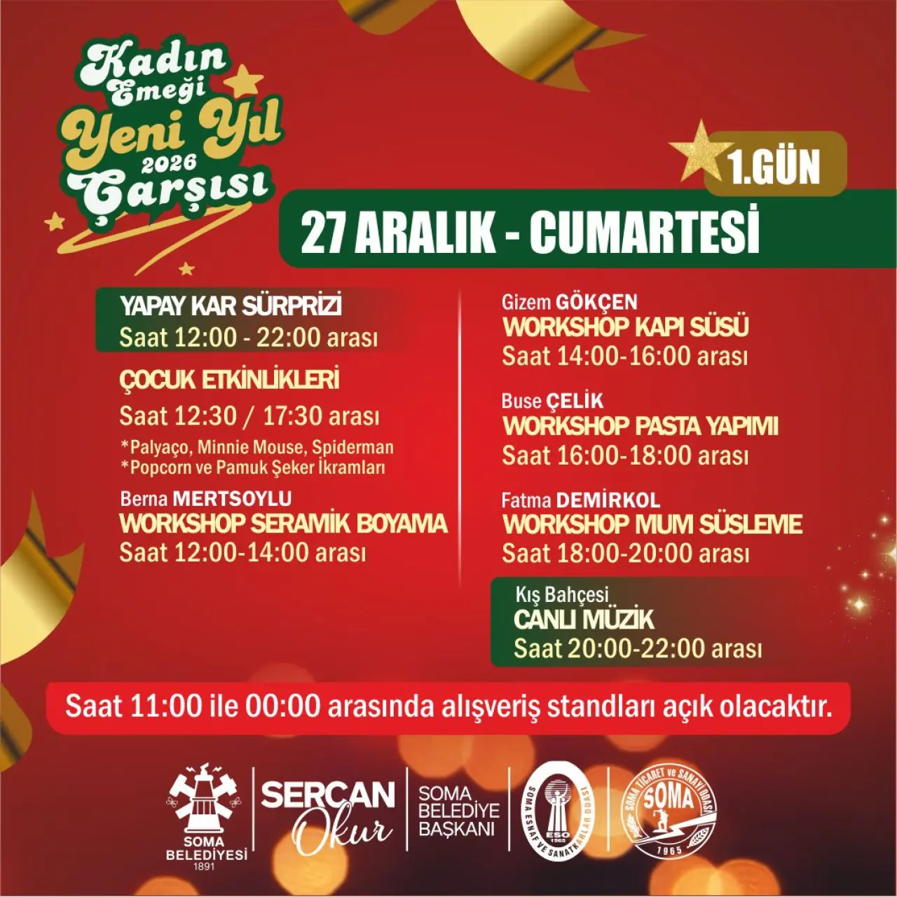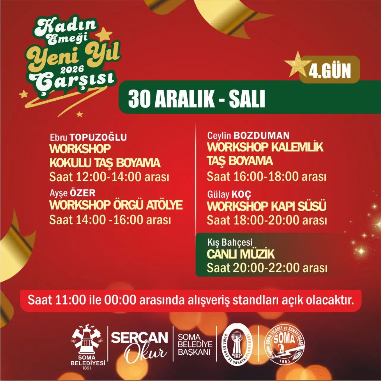 Soma Belediyesi tarafından hayata geçirilen organizasyon kapsamında, kendi emeğiyle üreten 40 kadın girişimci, el emeği göz nuru ürünlerini sergileyerek satışa sunacak. Takıdan seramiğe, örgüden dekoratif ürünlere, gıdadan hediyelik eşyalara kadar birbirinden özgün ürünler, yılbaşı atmosferi eşliğinde ziyaretçilerle buluşacak.