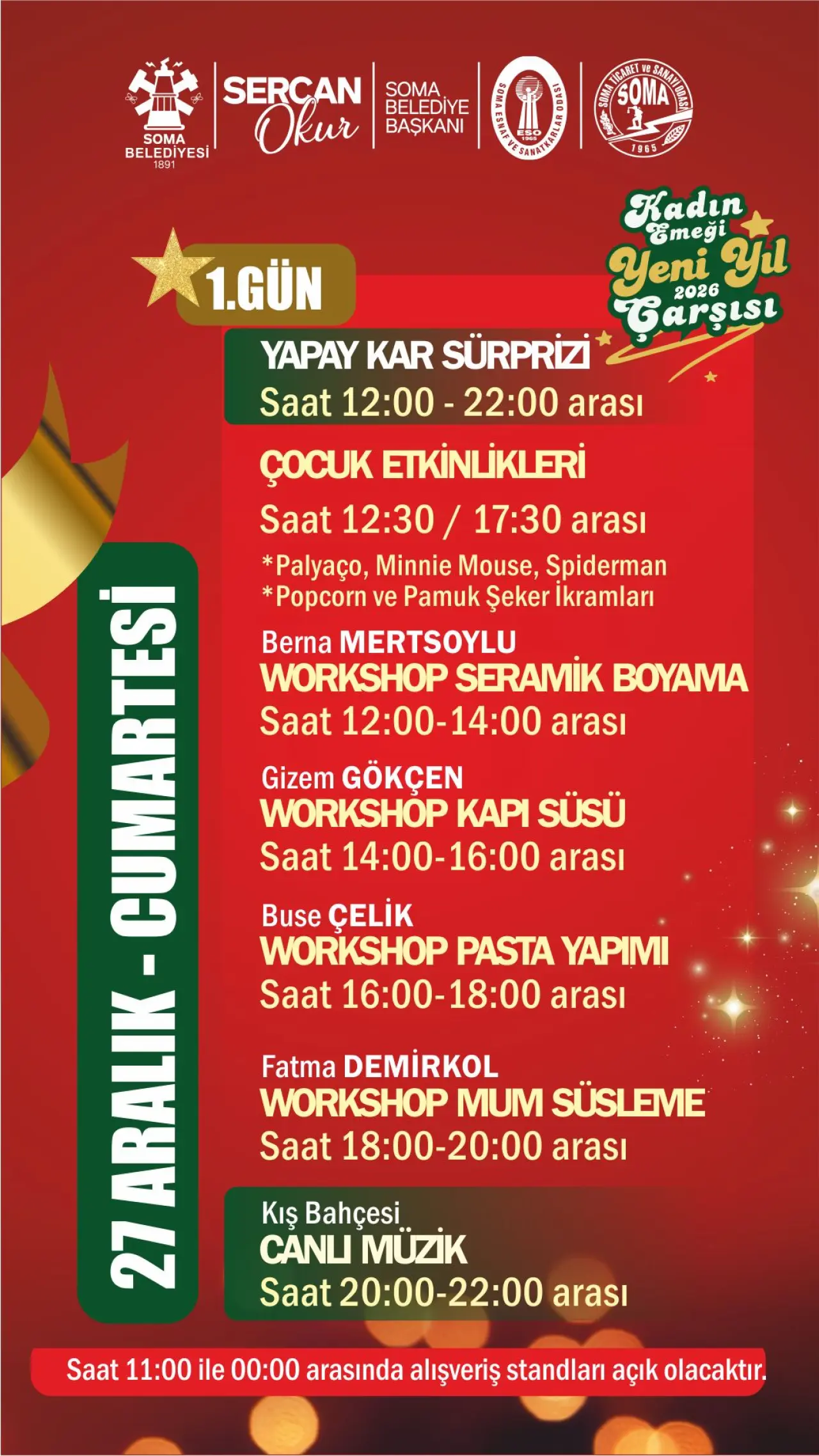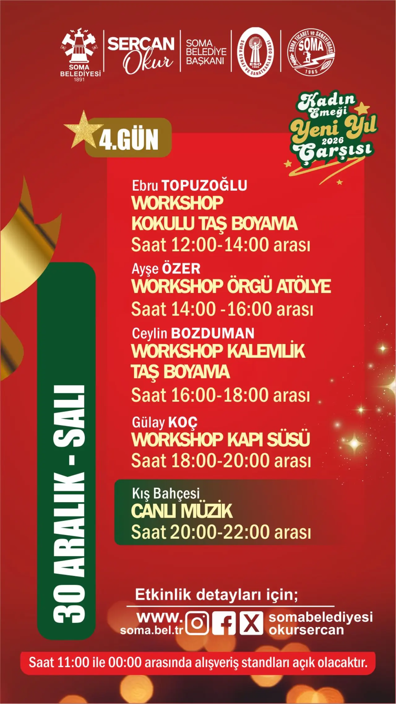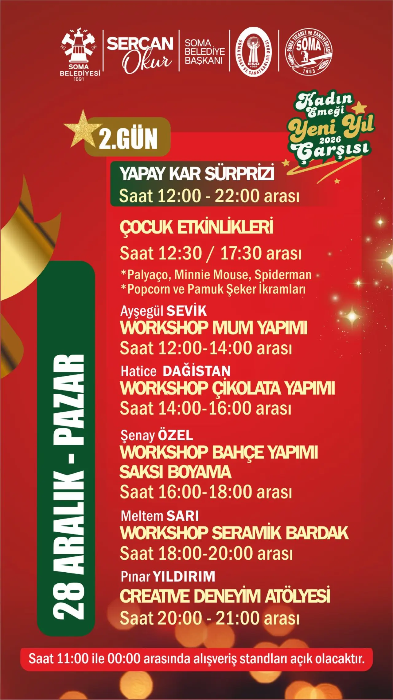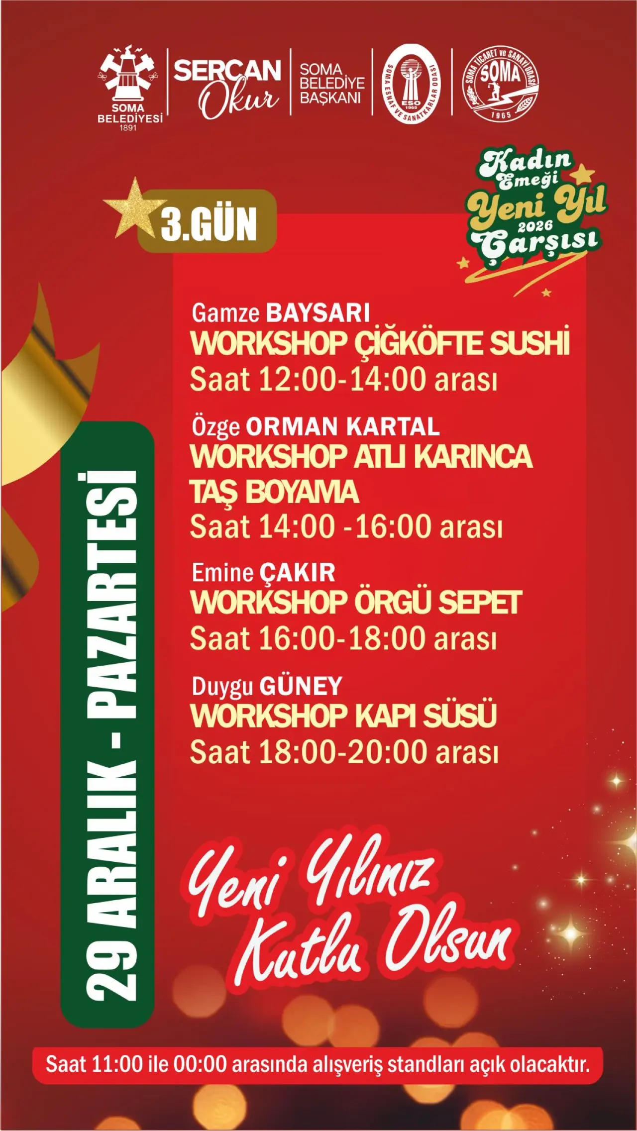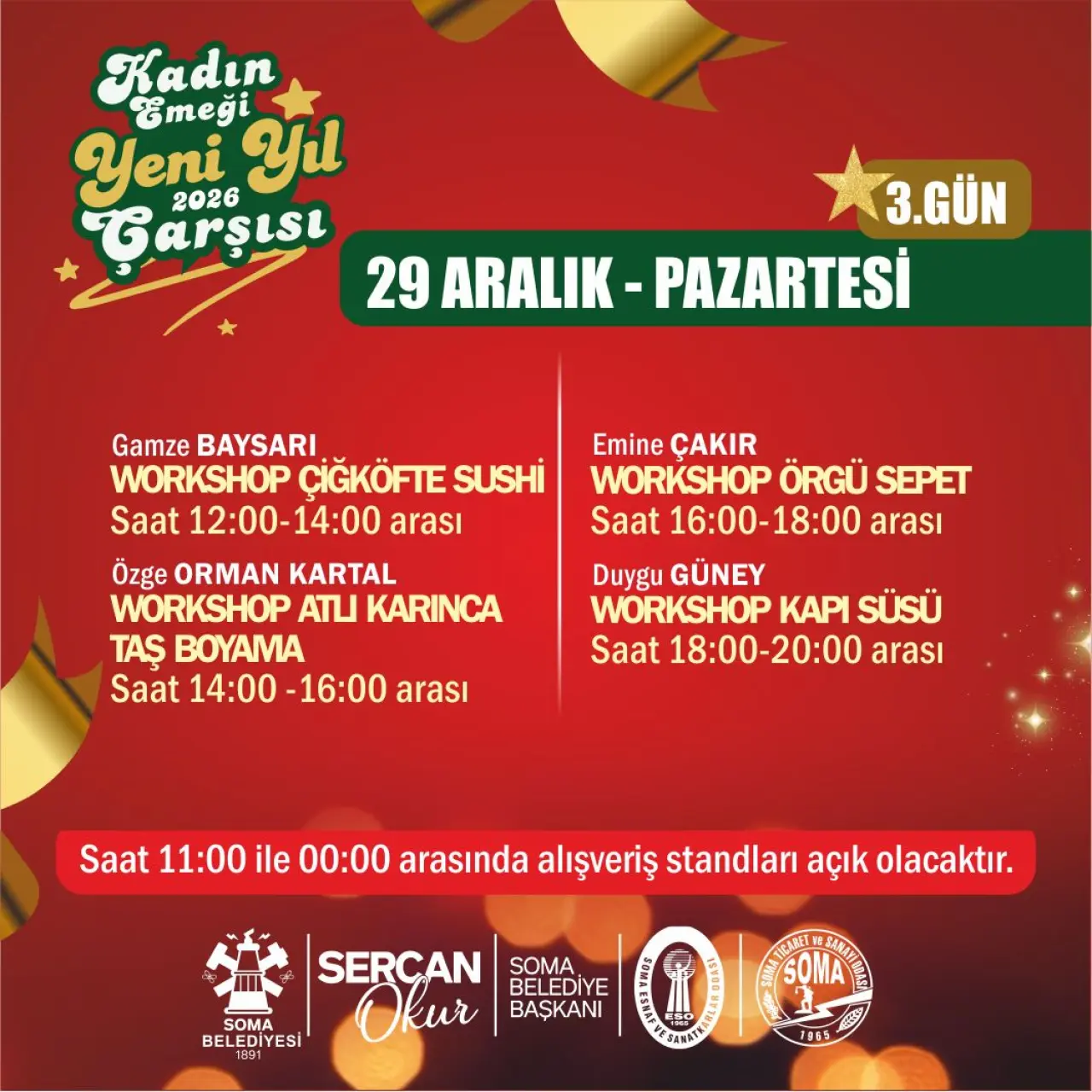 Soma Belediyesi tarafından hayata geçirilen organizasyon kapsamında, kendi emeğiyle üreten 40 kadın girişimci, el emeği göz nuru ürünlerini sergileyerek satışa sunacak. Takıdan seramiğe, örgüden dekoratif ürünlere, gıdadan hediyelik eşyalara kadar birbirinden özgün ürünler, yılbaşı atmosferi eşliğinde ziyaretçilerle buluşacak.