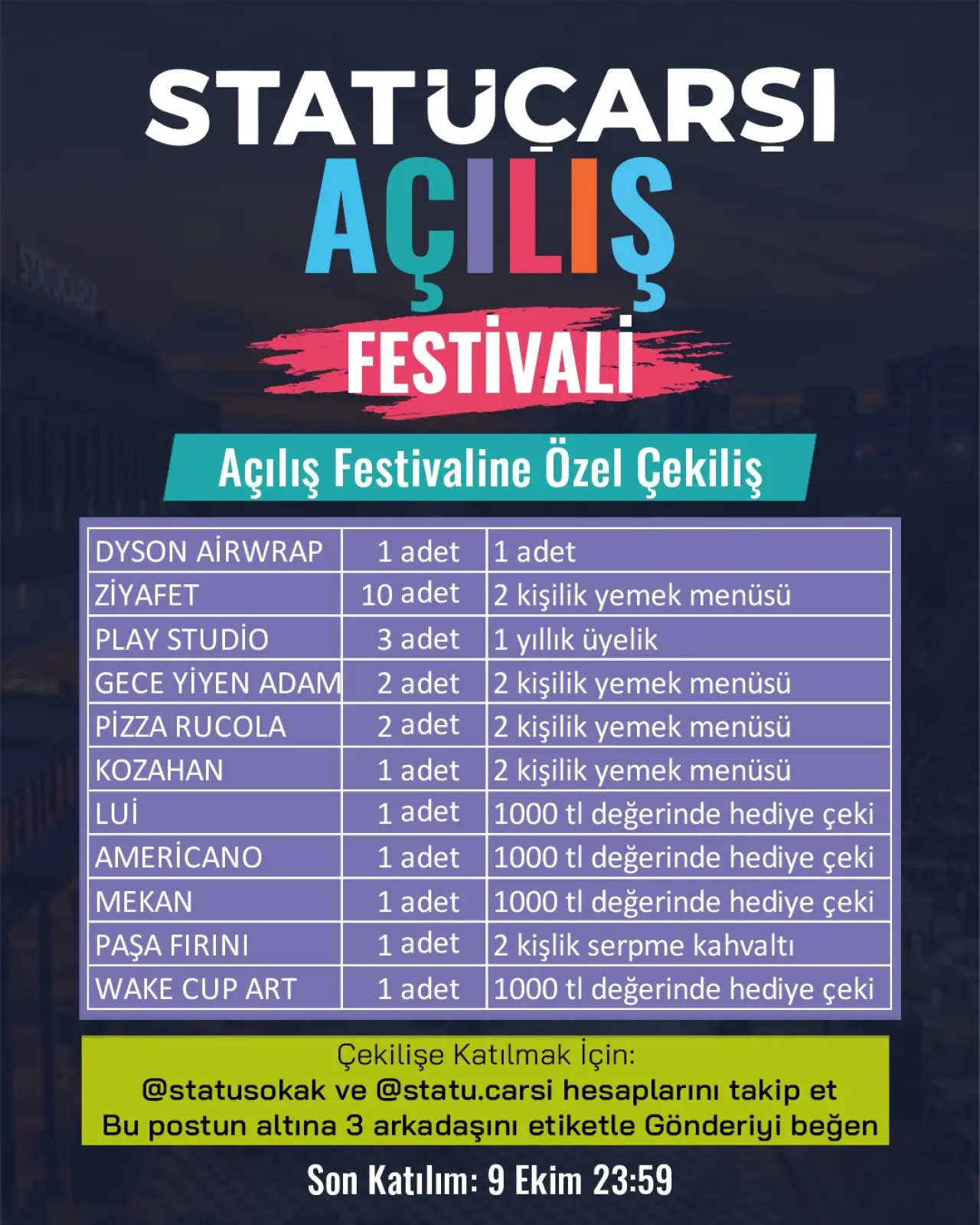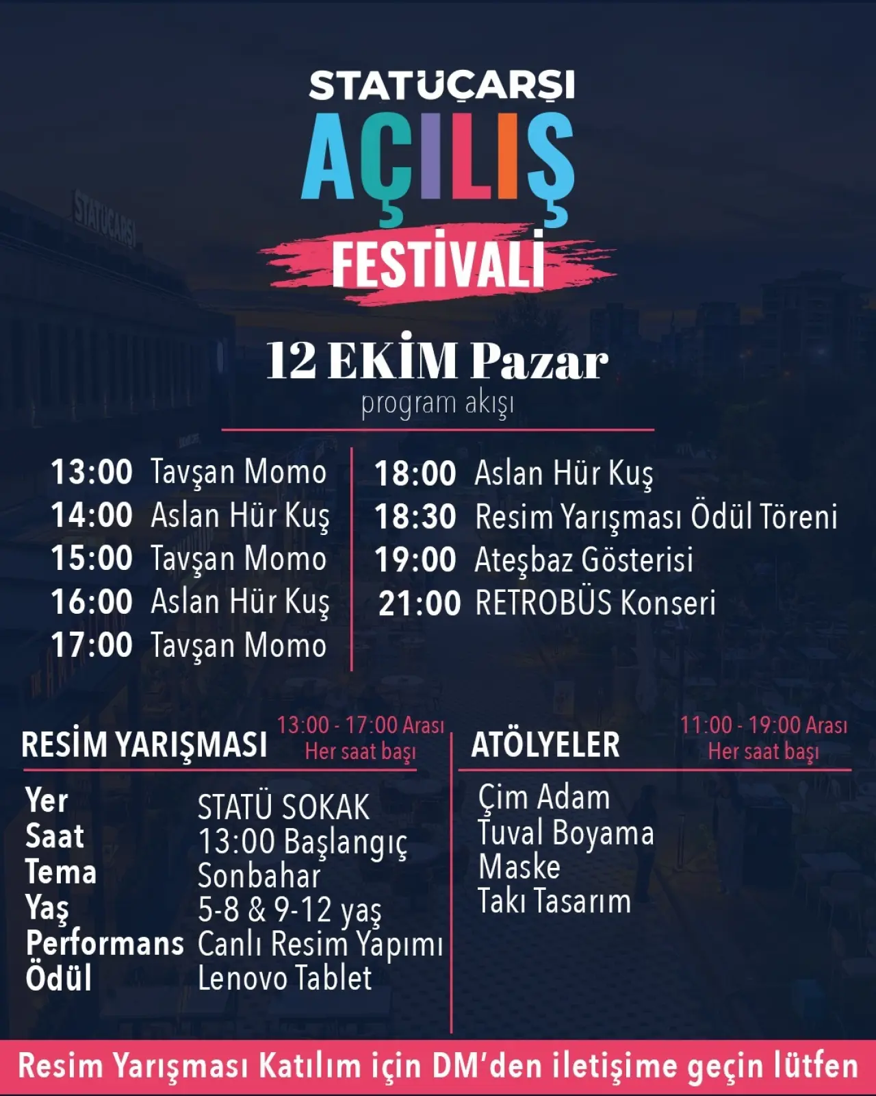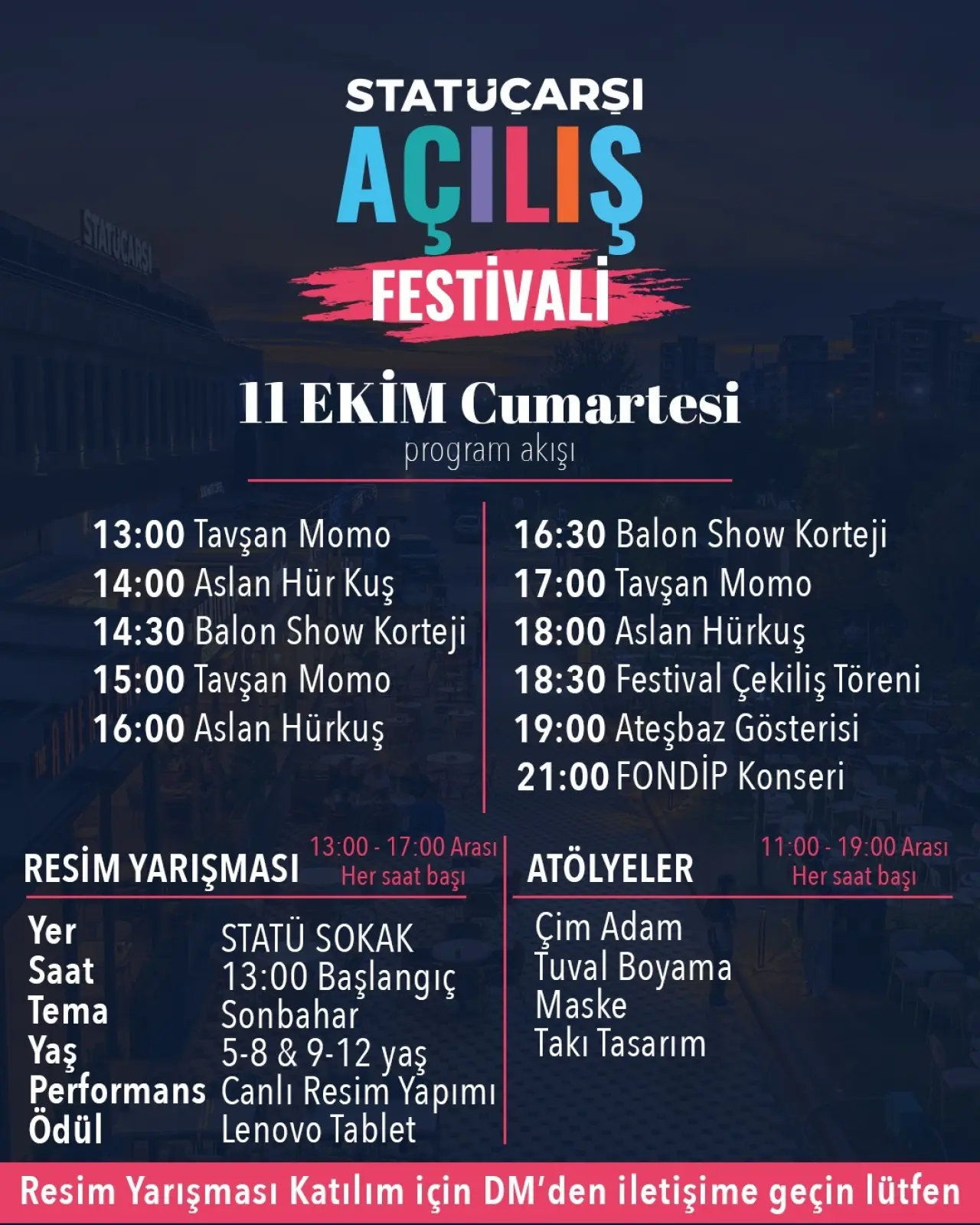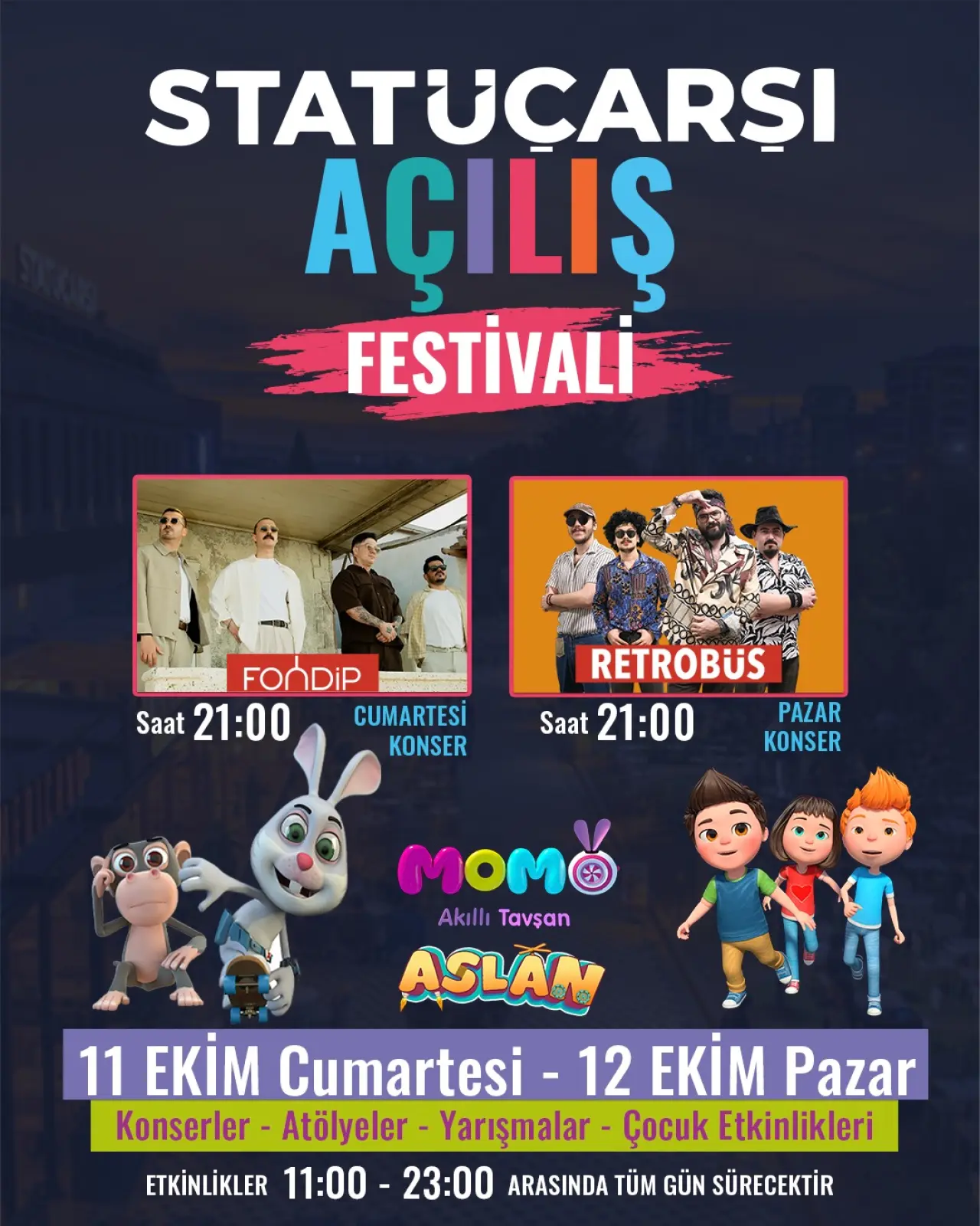 Manisa’nın yeni yaşam ve alışveriş merkezi Statü Çarşı, 11-12 Ekim tarihlerinde gerçekleştirilecek kapsamlı bir festivalle kapılarını açacak. Açılış etkinlikleri kapsamında gün boyu sürecek çocuklara özel gösteriler, eğlenceli aktiviteler ve akşam saatlerinde düzenlenecek ücretsiz konserler ziyaretçilerle buluşacak.
