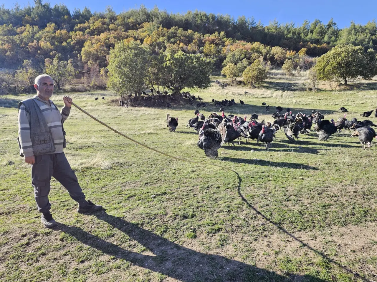 25 yıl boyunca tır şoförlüğü yapan ve Türkiye’nin dört bir yanını gezen Abdullah Yılmaz, mesleği vesilesiyle birçok farklı yerde hindi üretimi yapan kişilerle tanıştı. Üretim süreçlerini yerinde gözlemleyen Yılmaz, şoförlükten emekli olduktan sonra köyüne dönerek hindi yetiştirmeye karar verdi. Balıkesir’in Bigadiç ilçesindeki bir çiftlikten 200 adet hindi civcivi alarak işe başlayan Yılmaz, yaklaşık 7 aydır tamamen doğal ortamda hindi yetiştiriciliği yaptığını, günün büyük bölümünü hayvanlarını güderek geçirdiğini belirtti. Hindi yetiştirmenin zevkli ama oldukça meşakkatli bir iş olduğunu belirten Yılmaz, “Hindilerimi köyün çevresinde günde yaklaşık 10 saat güdüyorum. Her gün 7–8 kilometre yol yürüyorum. Benden en fazla 1 kilometre uzaklaşıyorlar, sonra beni görünce hemen geri geliyorlar. Akşamları ise buğday ve mısır ile besliyorum” dedi.