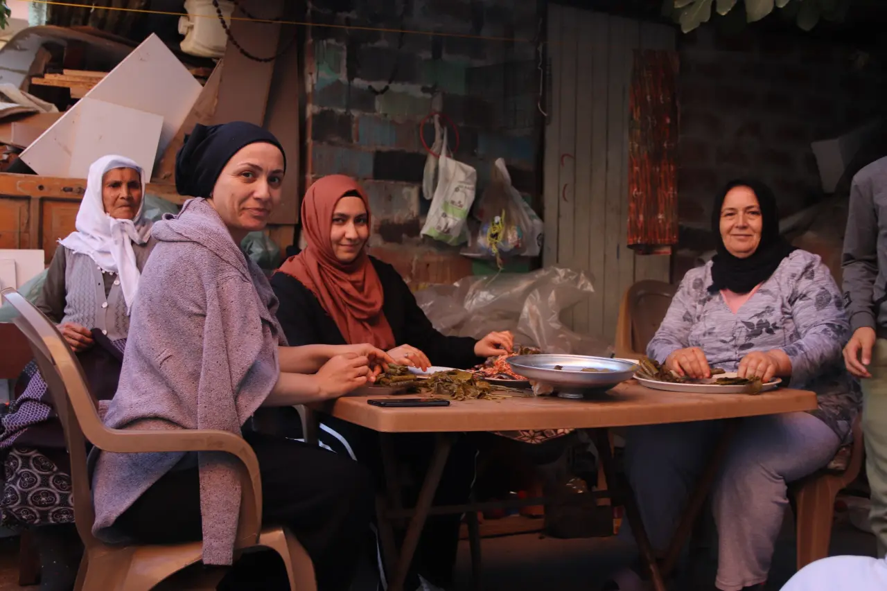 Turgutlu ilçesi Selvilitepe Mahallesinde bir araya gelen mahalle sakinleri toplandıkları bir komşularını evinin bahçesinde sarma sararak Gazze'ye destek amaçlı düzenlenen hayır panayırlarına gönderiyor.