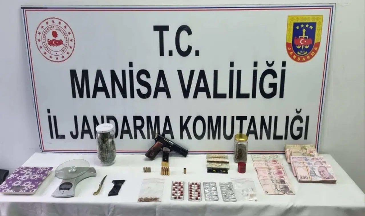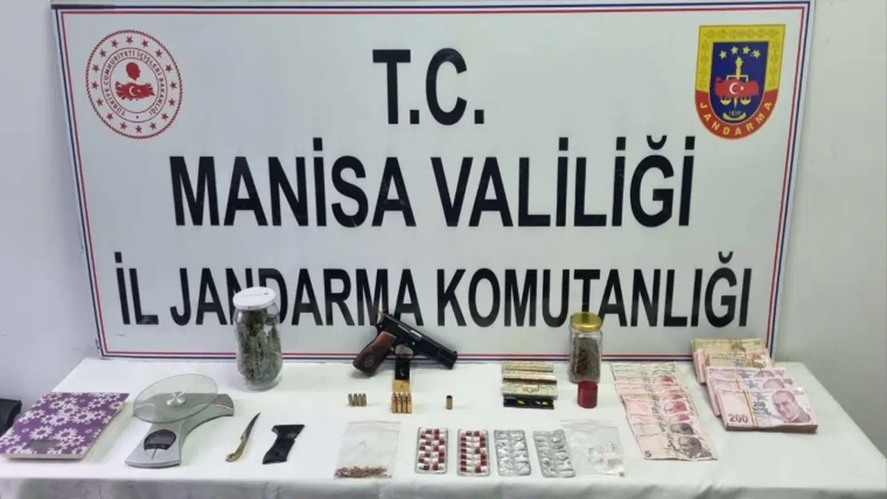 Manisa'nın Soma ilçesinde jandarma ekipleri tarafından M.G. (E/1984) adlı şahsın ikametinde ve aracında yapılan aramada 84 gram kubar esrar, 10 gram kokain, 28 adet sentetik ecza, 1 adet 9 mm ruhsatsız tabanca, 2 adet hassas Terazi, 50 bin 745 TL suçtan elde edildiği değerlendirilen para ele geçirildi. Şüpheli şahıs adli makamlara sevk edilmek üzere gözaltına alındı.İHA