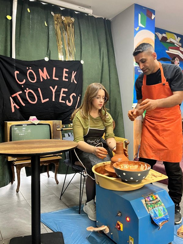 Yeşil Kitap Kahve’de gerçekleştirilen etkinlikte katılımcılar, çömlek ustası Sinan Pakel’in rehberliğinde geleneksel çömlek yapımını deneyimledi.