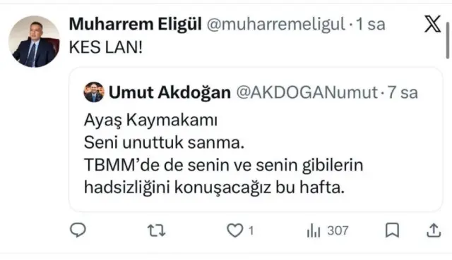 Daha sonra CHP Ankara Milletvekili Umut Akdoğan X’te “Ayaş Kaymakamı seni unuttuk sanma. TBMM’de hadsizliğini konuşacağız bu hafta” yazmış, Eligül’se bu paylaşımı alıntılayarak “KES LAN!” yazmıştı. Eligül daha sonra bu paylaşımı da silmişti. İçişleri Bakanlığı tarafından yapılan açıklamada ise görevden alınan Eligül’ün yeni görev yeri olarak Edirne Valiliği Hukuk Müşavirliği’ne atandığı ifade edilmişti.